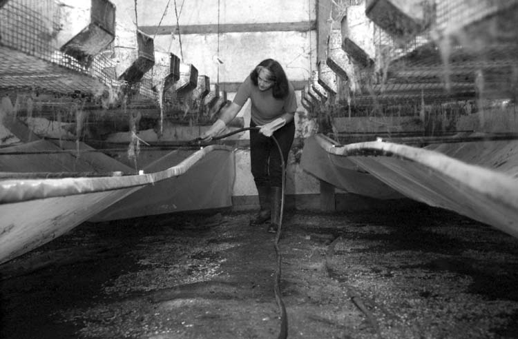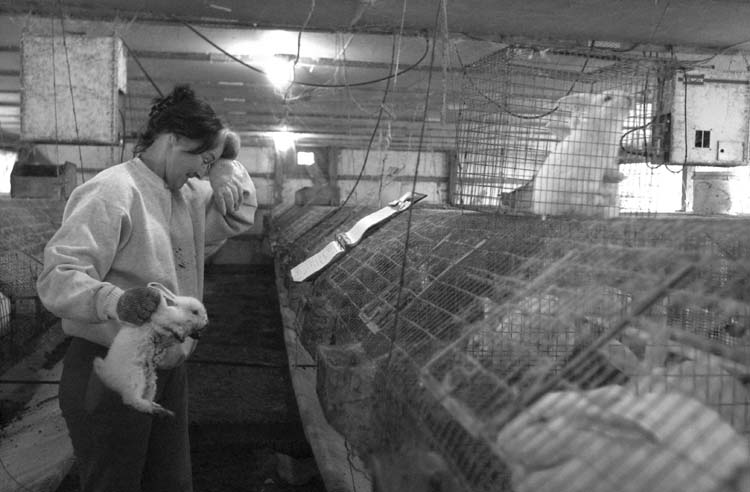 Sara Duncan of Duncan's Rabbit Ranch of Boston, Ky. and her husband John raise rabbits for domestic meat. On an average they house anywhere from 15 to 2000 rabbits. Rabbit meat is a very healthy meat having only 57 mg of cholesterol compared to chicken which has 70 mg.Sara Duncan of Duncan's Rabbit Ranch in Boston, Ky. weens the baby rabbits from their mothers. During the transport this rabbit escaped. "I hate getting my hands dirty," she said.Sara Duncan ofDuncan's Rabbit Ranch in Boston, Ky. cleans the barn where she keeps more than 2000 rabbits. "This time next year I'll be paying someone to do this for me," she said. Duncan raises the animals for meat, but says, "I hate getting my hands dirty."
