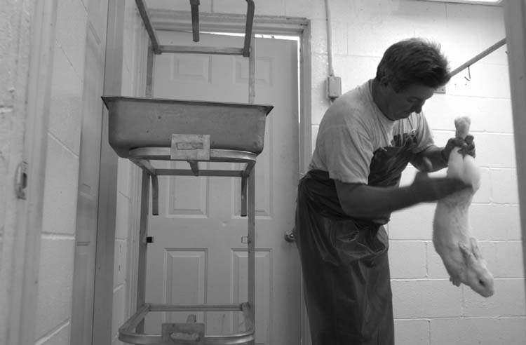Sara Duncan of Duncan's Rabbit Ranch in Boston, Ky. makes phone calls to area restaurants to pursuade them into including rabbit meat on their menus.John Duncan of Duncan's Rabbit Ranch in Boston, Ky. processes rabbits for meat. According to health standards the rabbits must be killed and cooled to a 45 degree body temperature in seven minutes. Duncan can do it in 45 seconds.