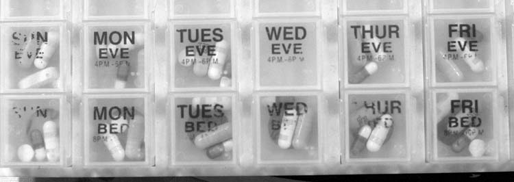 Jo Catherine Spalding reads her prayer book before going to a revival on Thursday night at the First Baptist Church. Although Spalding has been Catholic her whole life, she said that she is considering becoming Baptist.Jo Catherine Spalding keeps her pills in this box to keep them sorted out. Spalding said she takes seven pills a day for everything from the ringing in her ears to her heart.