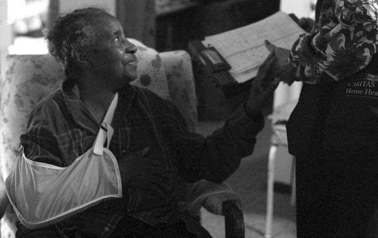 note: please fix tilt when you crop! thanks.Jo Catherine Spalding tells Barbara Hughes good-bye on Friday morning. Hughes comes on Mondays and Fridays to bathe Spalding. Hughes works with the Caritas Home Health and has worked in home health care for 13 years. "This is a rewarding job," Hughes said, "Because you're helping people and cheering them up."Jo Catherine Spalding naps Friday morning while her television plays BillCosby re-runs.