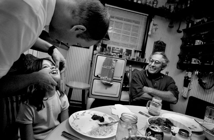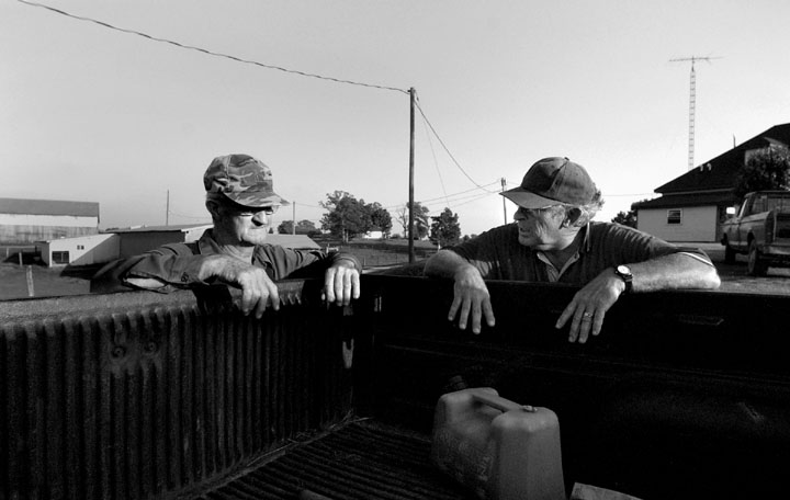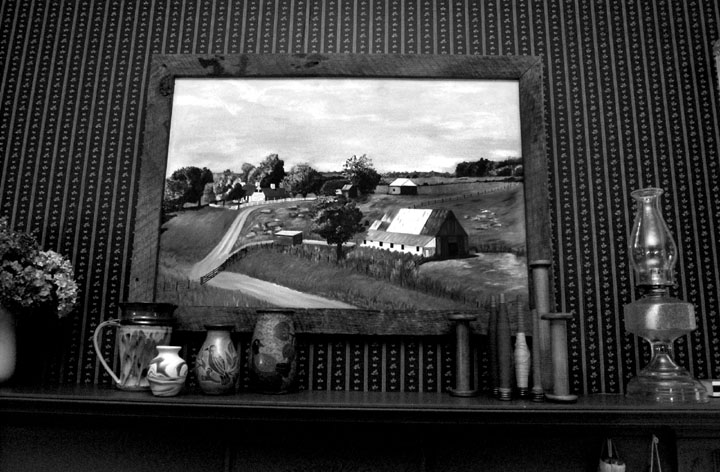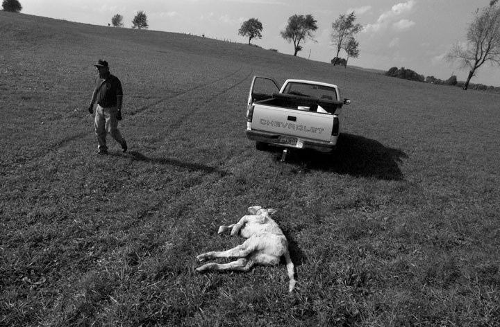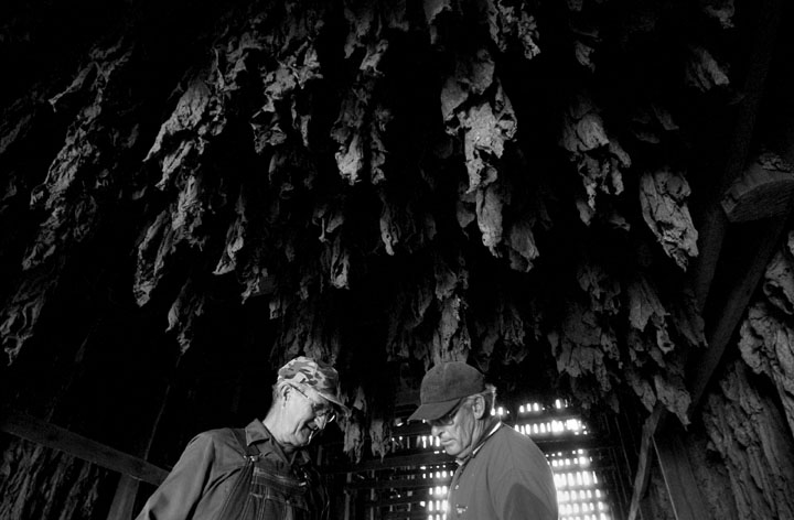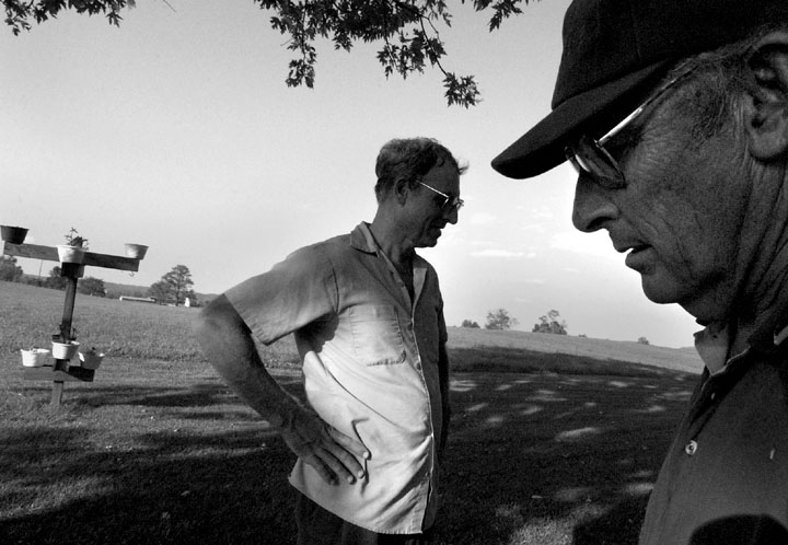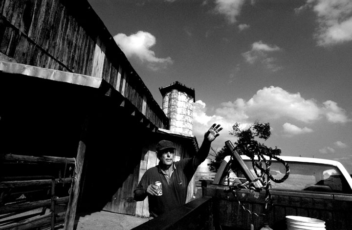 Dr. Sherman Arch Ballou was raised on the farm depicted in this oil painting by his wife Sharon. His father grew tobacco and raised cattle just as Sherman does today. 'Farming brings back memories, it's sacred to me.' In 1972 Ballou purchased the first 50 acres of what is now the 200 acre farm he calls Whitney Woods. Ballou restored the farm, reversing todays trend of breaking up the land and selling it to developers.Tobacco grown on Ballou's land hangs like stalactites from his neighbors barn. Ballou, right, concedes that tobacco is no good but adds, 'It's just these farmers gotta eat %26 have a car, etc. They've depended on it for so many years, to iliminate it would be taking away their livelihood.' A dead male baby calf is removed from the rest of the herd by cattle farmer Dr. Sherman Ballou. 'That calf got to big before he was born, probaly suffocated during birth.' Sadly Ballou adds, 'It can't be all good. Ya gotta have some bad with the good.'Ballou, right, and neighbor David Parsley have been helping one another farm for over 10 years. 'You have to have someone you can hollar at %26 call on, you can't do these things by yourself.'Ballou's son-in-law, Jason Coomer, performs a quick mouth check on granddaughter, Sydney Hyatt. Dr. Sherman A. Ballou came to Cave City to open his first dental clinic in 1967. All of Dr. Ballou's four children have followed him into medicine. 'Makes me feel good, never pushed them in that direction, they chose it on their own.' Even Dr. Ballou's daughter, Sara, married a dentist. 'I don't think there's any better people than these old farm people,' says Sherman Ballou, right. 'Rural America is honest.' Neighbor Otis Sturgeon, left, has been farming since he was seven years old. 'He's the salt of the earth,' Ballou says, 'as good as gold.'