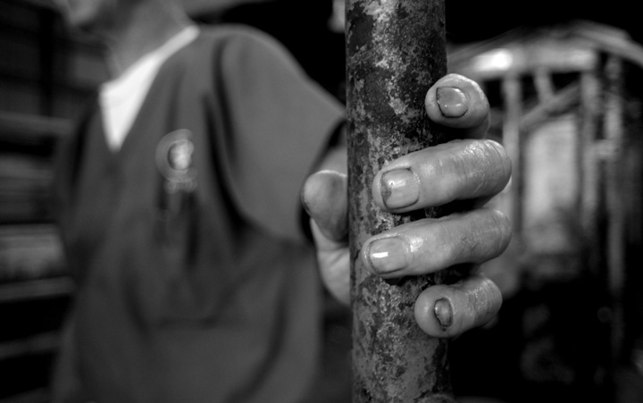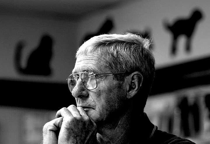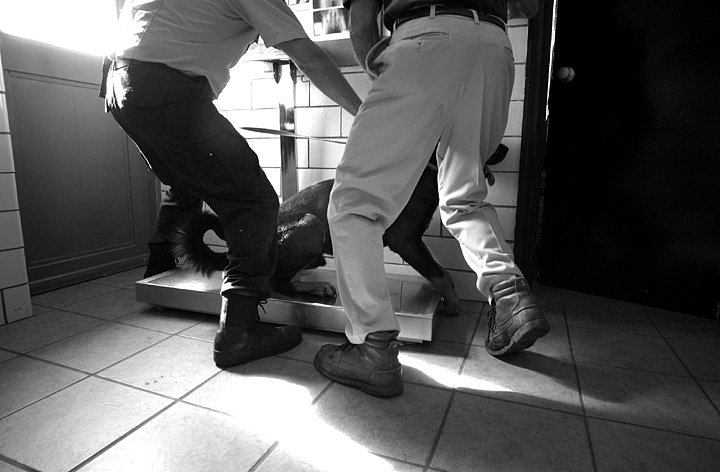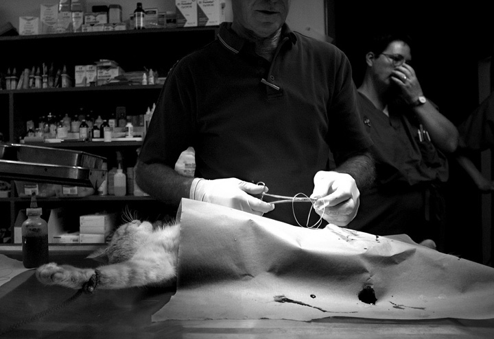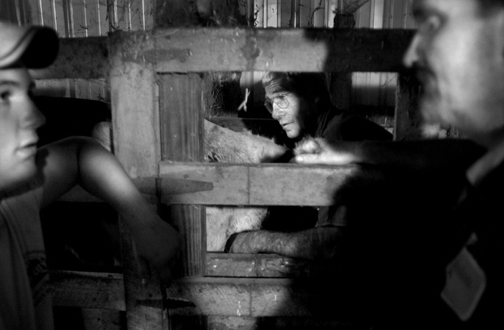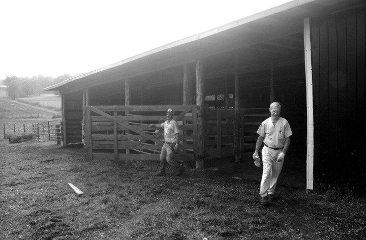 Dr. Guilfoil heads back to his truck after pregnancy checking 40 cows at the farm of Glyn Bowles and his son Larry.Veterinarian Bobby Austin Guilfoil, 67, is a senior partner at the Animal Clinic of Glasgow, which has two branches and treats large and small animals. The clinic also makes house and farm calls throughout Barren County.Guilfoil spays a cat from the Bowling Green Humane Society as vet tech Penny Riddle stands by. Alan Cumberland, an animal control officer for Glasgow-Barren County, and Dr. Guilfoil, right, lift a 90-pound Rottweiler onto the scales. The dog and his brother were brought in to be vacinated and neutered before being handed over to an animal rescuer. The dogs had been beaten and suffered from severe separation anxiety.Guilfoil, center, discusses a patient's condition with her owner, Mark Edwards, right, and his nephew Cory Coomer. The cow developed nutrient deficiencies after giving birth to her first calf .Guilfoil's 40 years of vet work in Barren County are reflected in his careworn hands.