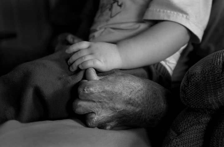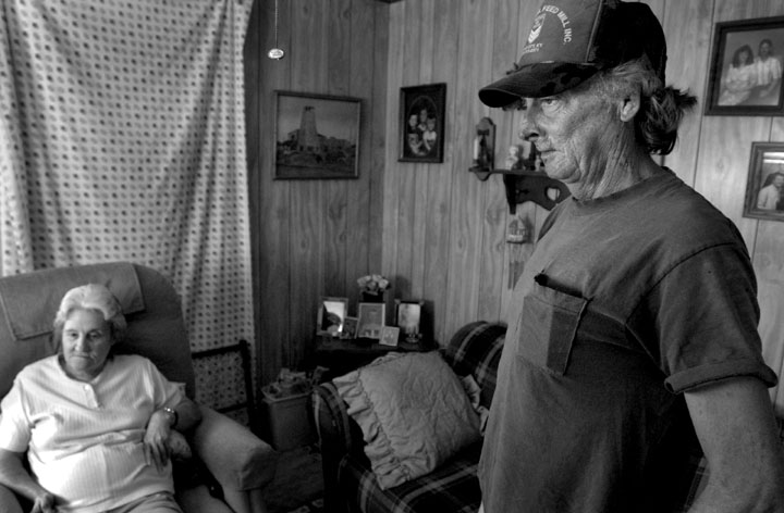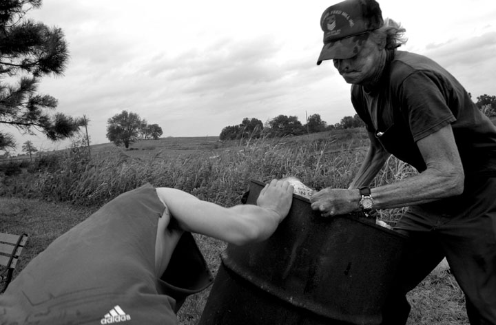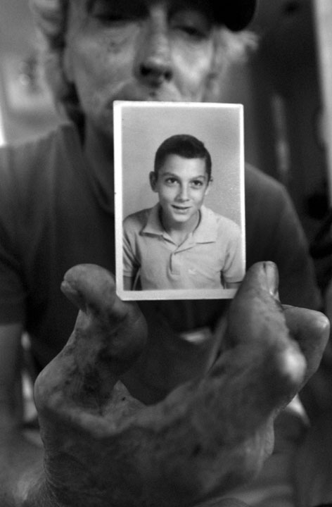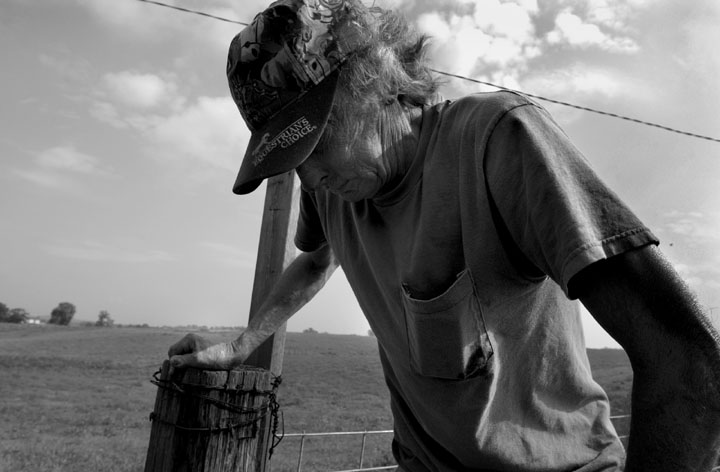 Chuck Bennett shows a portrait of himself in his teenage years before suffering severe burns to his hands, legs, and face. A propane gas explosion destroyed his families home on November 6,1971, leaving the Bennett family permantently scarred.Chuck is well acustomed to the chores that farm life demand. He grew up on a dairy farm and returned once again to farming after being turned down from factory jobs because of his disability. 'I was making a dollar per hour, and in the factory they were making five or six. It just wasn't fair.'Chuck visits his mom, Virginia, every other day to check up on her health. Virginia has trouble walking and Chuck worries that she will collapse and not be able to find help. She also was burned from the waist down in the house explosion, spending over a year recovering in the hospital where she also contracted hepatitis. Chuck with nephew, Bradley, load trash on to his flat bed tow truck. Strenuous work of this type has been limited for him since an artifical heart valve replacement in Fall 2000. Chuck now depends on a $540 disability check per month, and also tows cars to supplement this income.Chuck grabs his grandson, Jacob, 3, as he runs around in the back yard. Jacob usually comes from his parents house in Bowling Green to stay with his grandpa on the weekends.Chuck rests after he overworked himself loading garbage into the dumster with his nephew, Bradley, and his friend, Brian. He returned home early because his heart started beating fast and he became dizzy. The numerous surgeries in his life have started to take a toll. He calls himself 'a walking time bomb.'