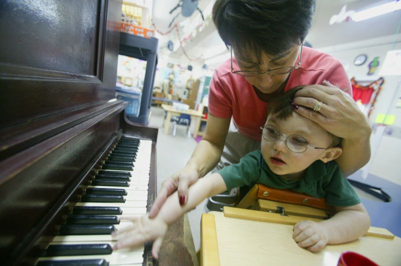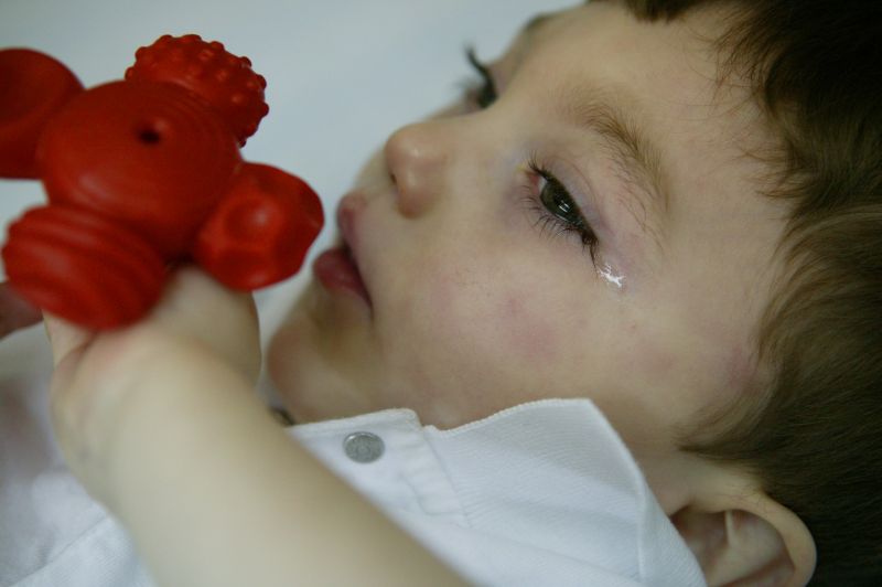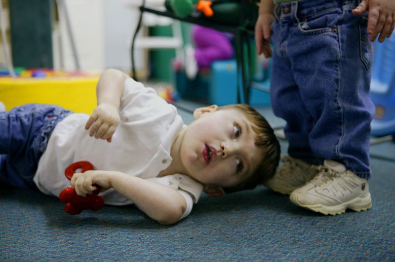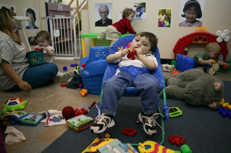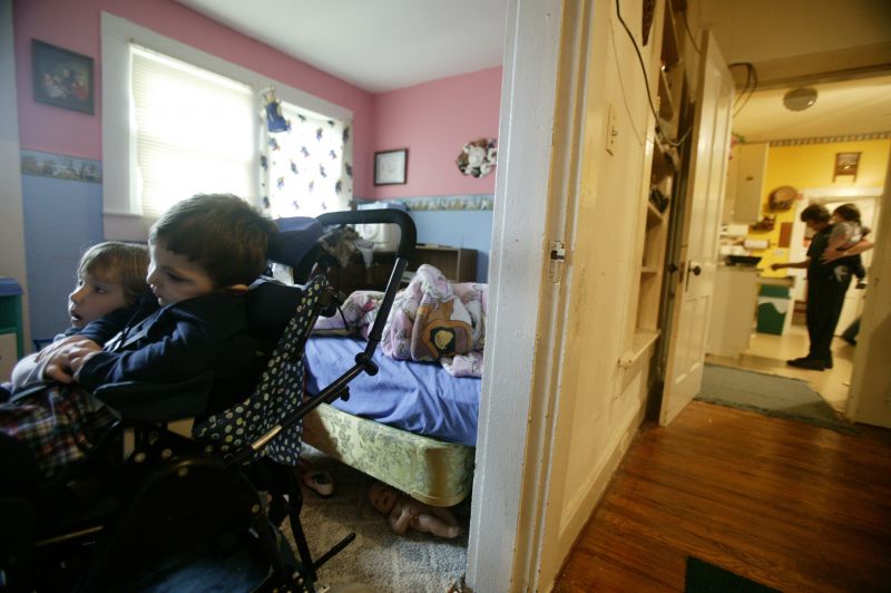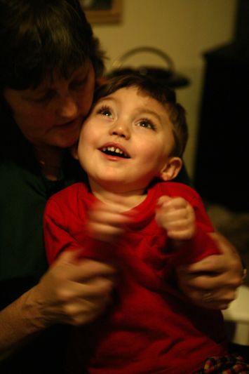 Luke's family stands over him in the early hours of the morning as Linda and Jimmy attempt to get all 4 grandkids washed up, dressed and ready the next day of school.Cassidy, 5 sits with her brother Luke as he sits in his special chair as Linda holds JC and cooks dinner at the same time. Finding any free time is tough for the grandparents who have 5 grown-up children of their own and now have to take care of 4 more.By 5am Luke and his siblings are ready to head to daycare. Jimmy needs to take multiple trips back and forth from the house to first carry Luke, then JC, then all of their bags to his truck.Linda plays patty-cake with Luke, 2, a bright moment in Luke's day. Luke suffers from Cerebral Palsy and most of the time his grandparents can't tell his mood most of the day.Luke looks over at a classmate that stands looming above him. Luke most likely will never walk, but with therapy they hope that he will be able to sit amongst his peers and communicate through a computer.When in the standing chair, Luke now is able to tour the entire daycare center and spends that time trying out new activities.Miss Elizabeth, a caregiver at Luke's daycare center, feeds the two-year-old through a tube in his stomach. Cerebral palsy deprives Luke of the muscle control he'd need to swallow on his own, so a liquid formula provides all his nutrition.A tear slips down the side of Luke's face, he seldom cries for any reason and has never given the daycare any problems.Not involved with the mess that erupts in the room every play time, Luke sits comfortably in his special chair as classmates Katelyn Deering, 1 (left), Braelyn Lee, 1 (center), and Brayden Thompson, 1 (right), put every toy available on the floor.