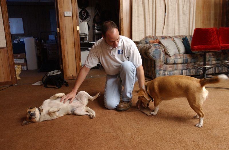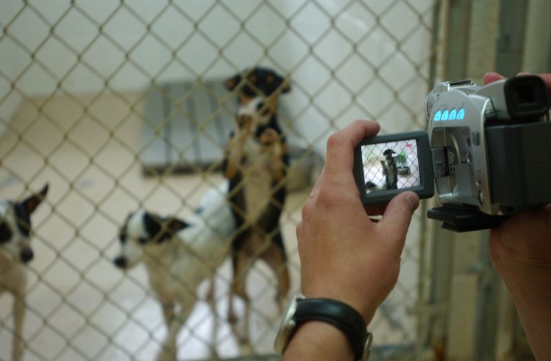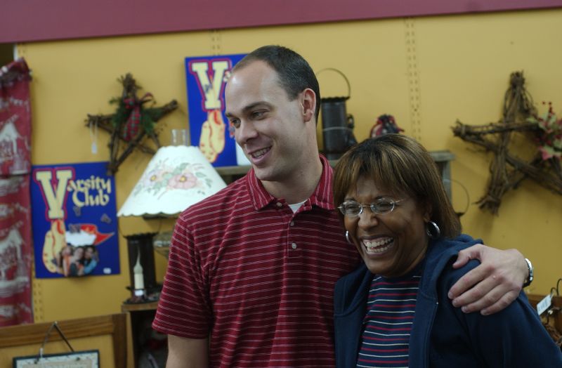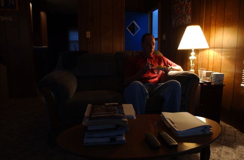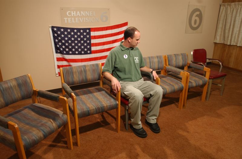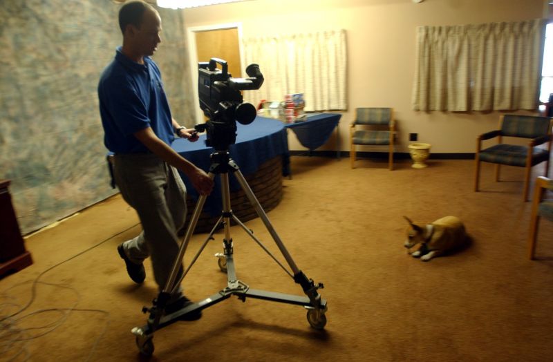 White replaces a light bulb that has been burned out for over a month in preparation for the political debate later that evening. When White bought the station from Lebanon patriarch J.T. Whitlock in 1999, it came with a shack and mostly outdated, unusable equipment. Gary White, owner, producer, general manager, videographer, and sales person of Channel Six Television moves his camera into a room with a window to tape a weather shot for his news program, Community Focus. The station, which is located in a double-wide traitor, first started showing local programming four years ago, shortly after White bought it. The previous owner, J.T. Whitlock, started the station in 1988 and only showed western movies. "Whoever gets this chair is not going to be happy," says Gary White as he checks the height of candidates' chairs a few hours before they arrive. "In the television age, he may lose the race over this," he jokes as he prepares for the third annual city council debate at the Channel Six TV station. Lebanon city council candidates Jim Richardson (from left), Elizabeth Ann Osborne, and Bill Pickerill wait their turn to speak Tuesday evening at the third annual debate at the station. Seven of the eight candidates participated and gave their views on the tourism tax, abandoned buildings, the aquatic center, and the sewer tax.Gary White videotapes puppies at the Marion County Animal Shelter Monday afternoon. He visits the shelter week lyto show viewers the dogs and cats up for adoption. He adopted Keller, his corgi-mix, last year after videotaping her. Gary introduces friend and Channel Six Television personality Yvonne McNary to a viewer while on a trip to pick up donations for the station's live auction.Before the candidates arrive Gary White puts Keller inside his home, which is about 30 yards from his TV station. Before running out on a sales call Gary White, 31, pets his dogs Keller (left), adopted last year after videotaping her at the animal shelter, and Bailey, who showed up at the station three years ago."I don't remember the last commercial I just ran," says Gary White, owner, general manager, videographer, producer and salesman of Channel Six Television, as he produces a live city council debate Tuesday evening. White had to lay off his only two employees last November, but one of them helped videotape the live forum while White stayed in the control room.Gary White eats leftover macaroni and cheese for breakfast in his trailor while watching "Good Morning America."