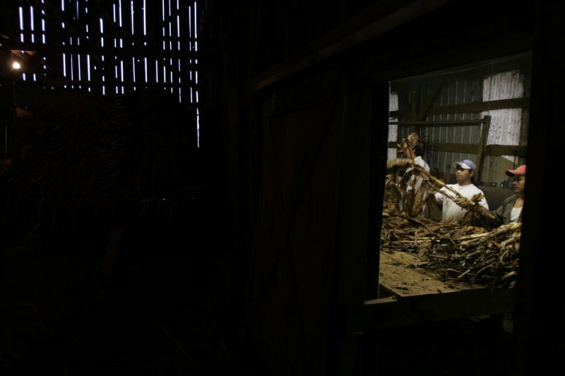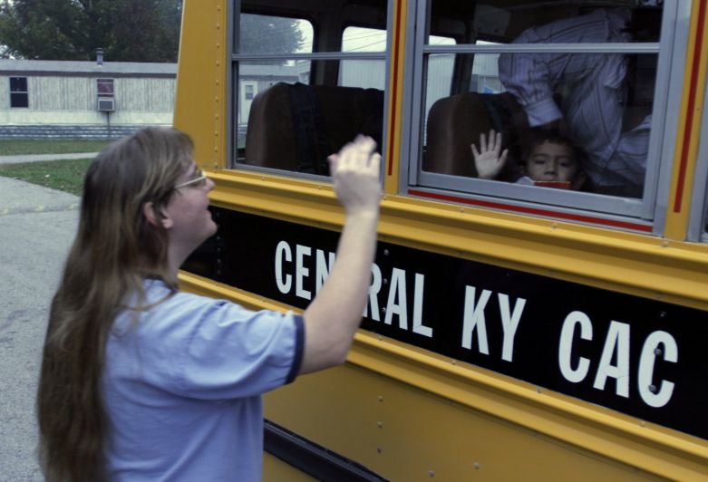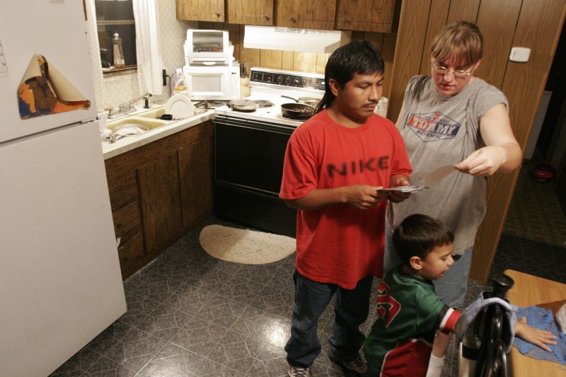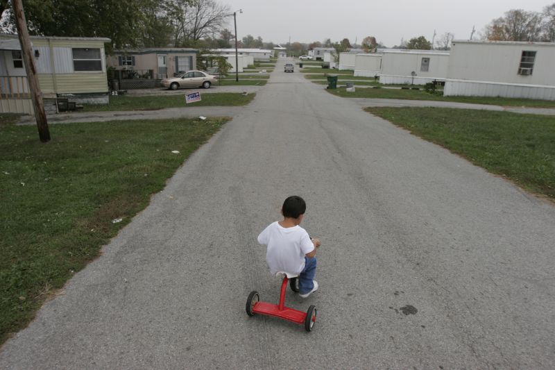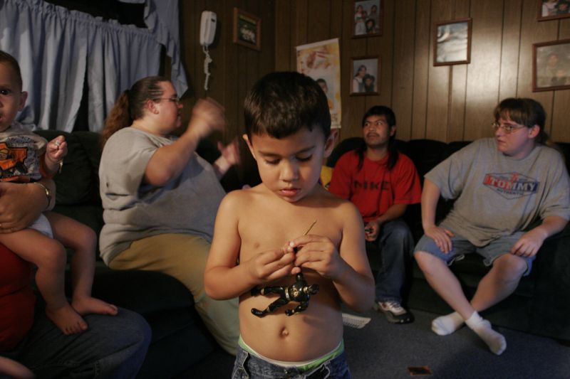 Jose and Missi Venegas are frequently visited by family members who also live in their mobile home park. Vicente's grandmother Dixie Reardon, holding cousin Andreas, and aunt Linda Spears, visit with Jose and Missi, while Vicente plays with one of his many action figures.Missi Venegas said that her son Vicente sometimes whines when he has to go to school, but when the bus comes his attitude changes. Both Missi and her husband Jose want to provide the best education for Vicente.Jose Venegas works long hours stripping tobacco in a dank barn, outside Lebanon. Working from job to job, Venegas takes work wherever he can find it to support his family. Venegas said it's difficult not knowing when he will be out of work and when the next job might come.Jose and Missi Venegas look over photographs sent from Jose's relatives. Photographs are all that their son Vicente has seen of his extended family.Vicente Venegas heads out to visit his grandparents, who also live in Brookhaven Trailer Park. Hand in hand, the men of the Marion County Detention Center sing "Jesus Loves Me," during a service led by members of the New Beginnings Community Church.Scott Cissell's irreverent scarecrow greets passersby along Route 84 just outside Raywick. "You gotta know how to pick your pumpkins," said Cissell,"the flat ones make the best butt cheeks."