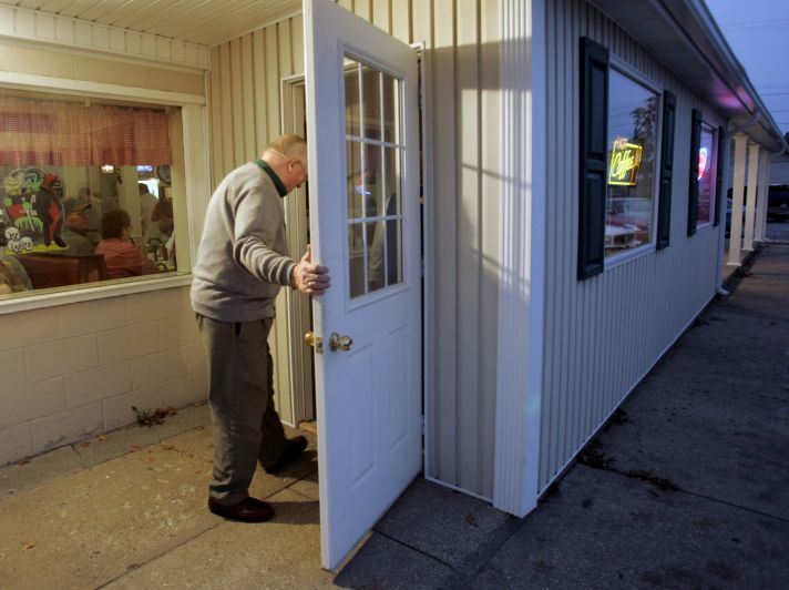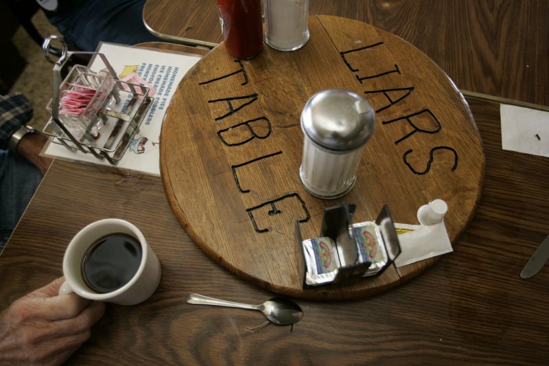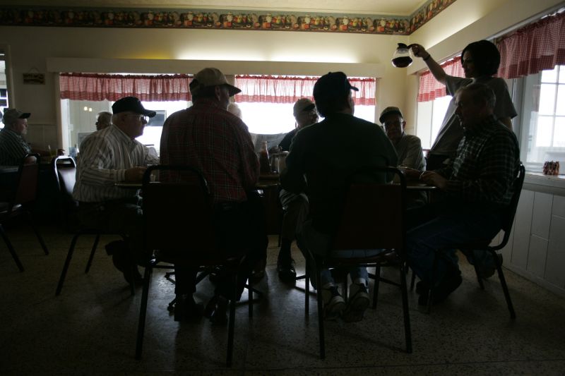 The Cedarwood Restaurant on East Main Street, just on the outskirts of the quiet town of Lebanon, in central Kentucky, has a loyal local clientele and has been a popular gathering place since 1956. Many customers have been coming into the breakfast, lunch and dinner diner for thirty years or more. One long table, known as the Liars Table, is almost continuously occupied from morning to night by a cast of characters drawn from the Lebanon community. As one customer finishes his coffee and stories and departs, another takes his place.Cedarwood Restaurant waitress Katie Myers, 20, pours non-stop coffee for old-timers at the Liars Table. The Cedarwood Restaurant is on East Main Street on the outskirts of the quiet town of Lebanon, in central Kentucky. It has a loyal local clientele and has been a popular gathering place since 1956. Many customers have been coming into the breakfast, lunch and dinner diner for thirty years or more. The Liars Table is almost continuously occupied from morning to night by a cast of characters drawn from the Lebanon community. As one customer finishes his coffee and stories and departs, another takes his place.The Cedarwood Restaurant on East Main Street, just on the outskirts of the quiet town of Lebanon, in central Kentucky, has a loyal local clientele and has been a popular gathering place since 1956. Many customers have been coming into the breakfast, lunch and dinner diner for thirty years or more. One long table, known as the Liars Table, is almost continuously occupied from morning to night by a cast of characters drawn from the Lebanon community. As one customer finishes his coffee and stories and departs, another takes his place.Cedarwood Restaurant regular GL Thompson enjoys a bottomless cup of coffee at the Liars Table. The Cedarwood Restaurant is on East Main Street on the outskirts of the quiet town of Lebanon, in central Kentucky. It has a loyal local clientele and has been a popular gathering place since 1956. Many customers have been coming into the breakfast, lunch and dinner diner for thirty years or more. The Liars Table is almost continuously occupied from morning to night by a cast of characters drawn from the Lebanon community. As one customer finishes his coffee and stories and departs, another takes his place.Cedarwood Restaurant waitress Kelli Cecil (cq), 20, is stopped in her tracks by Paige Beavers, 11-months-old, daughter of restaurant manager Randy Turpin. The Cedarwood Restaurant is on East Main Street on the outskirts of the quiet town of Lebanon, in central Kentucky. It has a loyal local clientele and has been a popular gathering place since 1956. Many customers have been coming into the breakfast, lunch and dinner diner for thirty years or more. One long table, known as the Liars Table, is almost continuously occupied from morning to night by a cast of characters drawn from the Lebanon community. As one customer finishes his coffee and stories and departs, another takes his place.Joe Pittman smokes his pipe while sitting on his favorite stool at the Cedarwood Restaurant on East Main Street, just on the outskirts of the quiet town of Lebanon, in central Kentucky. The restaurant has a loyal local clientele and has been a popular gathering place since 1956. Many customers have been coming into the breakfast, lunch and dinner diner for thirty years or more. One long table, known as the Liars Table, is almost continuously occupied from morning to night by a cast of characters drawn from the Lebanon community. As one customer finishes his coffee and stories and departs, another takes his place.Al Turpin and Jessie Mattingly get cozy in a booth at the Cedarwood Restaurant on East Main Street on the outskirts of the quiet town of Lebanon in central Kentucky. The couple have been friends and neighbors for 45 years. After they both lost their spouses, they began dating five years ago. "In winter our neighbors have noticed the path between our homes," laughed Jessie. The Cedarwood has a loyal local clientele and has been a popular gathering place since 1956. Many customers have been coming into the breakfast, lunch and dinner diner for thirty years or more. One long table, known as the Liars Table, is almost continuously occupied from morning to night by a cast of characters drawn from the Lebanon community. As one customer finishes his coffee and stories and departs, another takes his place.Steve and Cristie Deering and their son Trae, four-years-old (all cq), are regulars at the Cedarwood Restaurant on East Main Street, just on the outskirts of the quiet town of Lebanon, in central Kentucky. "Trae's been coming in with us since he was a baby," says Steve. The restaurant has a loyal local clientele and has been a popular gathering place since 1956. Many customers have been coming into the breakfast, lunch and dinner diner for thirty years or more. One long table, known as the Liars Table, is almost continuously occupied from morning to night by a cast of characters drawn from the Lebanon community. As one customer finishes his coffee and stories and departs, another takes his place.