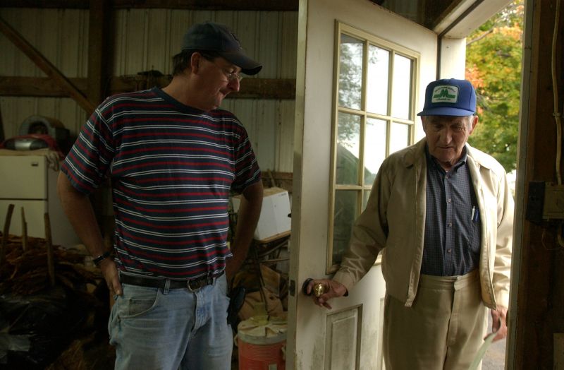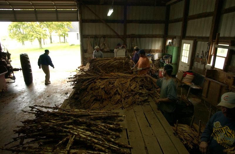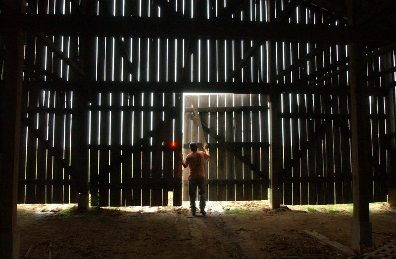 Dionicio Mora opens a tobacco barn door at Hill Acres fram near Lebanon, Ky. Where farm labor is limited due to an increase in manufacturing jobs, Mora and other migrant laborers from Mexico now handle some of the chores that the farm's family once performed. Eddie Hill (left) talks with his father Ed "Buck" Hill at their family farm near Lebanon, Ky. Age has caught up with the Buck, who has all but given the responsibility of operating the farm to his youngest son Eddie. "Eddie's the boss now," Buck said.When the word came that one of the cows on Hill Acres was escaping through a hole in the fence, Ed "Buck" Hill (foreground) and his son Eddie responded to make the necessary repairs. Eddie is the only child of seven that chose to remain on the farm, and his father is extending the responsibility to his son.