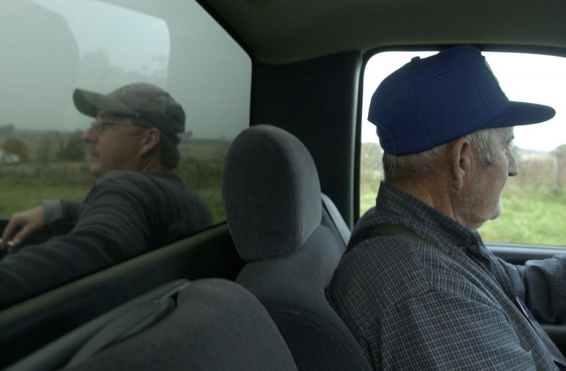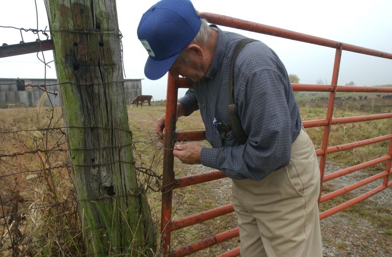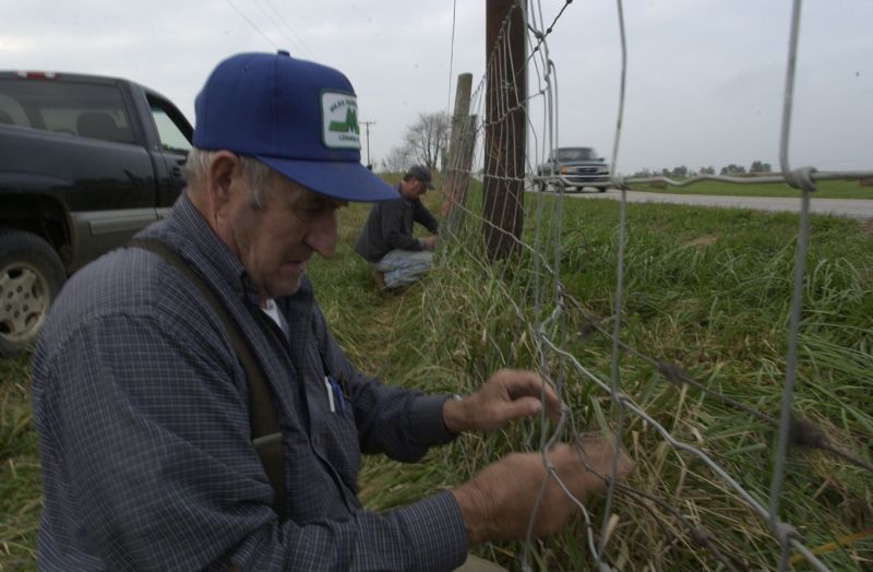 Eddie Hill picks loose tobacco leaves off the dirt floor of a barn at Hill's Acres near Lebanon, Ky. After coaxing a cow into a small grazing area, Ed "Buck" Hill ties a cattle fence on his farm near Lebanon, Ky. Age has caught up with the senior farmer, who has all but given the responsibility of operating the 490-acre farm to his youngest son Eddie. In addition to the cattle operation, the two grow tobacco, corn and soy beans.Ed "Buck" Hill (left), is the patriarch of Hill Acres, a 490-acre farm near Lebanon, Ky., exits a barn where harvested and dried tobacco is striped, sorted and baled by migrant workers from south central Mexico. His son Eddie, his youngest son from a family of seven children, is the only child to remain on the farm. Eddie (left) and his father Ed "Buck" Hill return from making repairs on a cattle fence on Hill Acres near Lebanon, Ky. Buck and his wife Mary have raised seven children at his farm in Lebanon, Ky. Eddie is the only child of seven that chose to remain on the farm, and his father is extending the responsibility to his son.