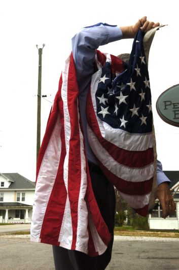Wrapped up in an end-of-the-day task, Postmaster Clellan Hays lowers the American flag at the Gravel Switch Post Office.