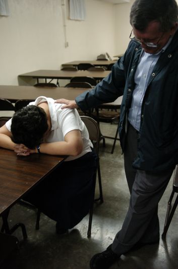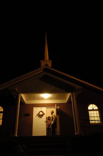 EDT-Lynne WarrenBefore the Cottage Prayer meeting at Grace Baptist Church, Pastor Clellan Hays prays with his wife, Brenda. "Till death do us part, that's what I say," Pastor Hays said of his wife. It was 8:30 at night, Wednesday night Bible Study was over, and Pastor Clellan Hays locked the front door of Grace Baptist Church. His day began 14 hours before, as he prepared for his day's work at the Gravel Switch Post Office.