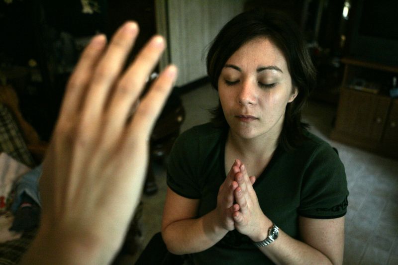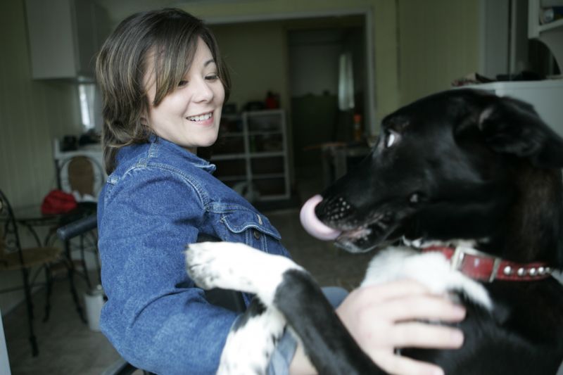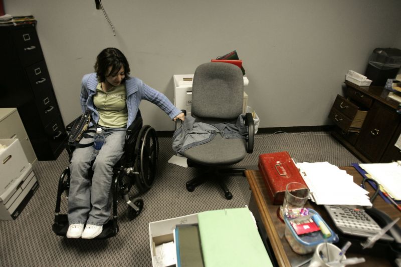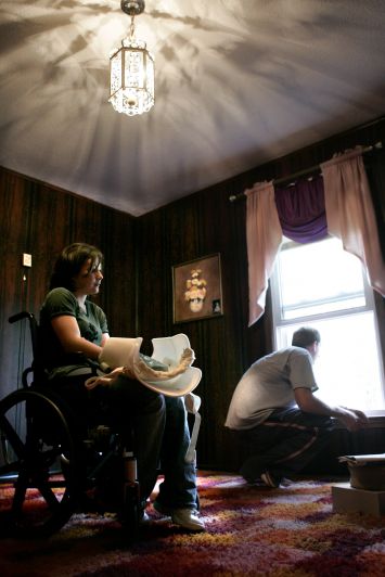 Despite being Catholic, Maria Probus still maintains a connection to her Asian heritage. Friend and Religious Minister Kenji Kawaguchi performs the "Mahihakri-no-waza" which is a spiritual purification ceremony. Maria tries to perform the prayer once a day, six days a week. Maria and her boyfriend Frankie Spears moved into a one-story house Maria bought one month ago. After packing her belongings from her room in her grandmother's house, Frankie takes her back down to the first floor. Maria has worked as the payroll manager at Tradewinds Transit Inc. in Bardstown, Ky., for over a year. On her second day back at work, Maria tries to maneuver her old chair away from the desk so that she can wheel up to it. Maria's Dodge Intrepid needs to be modified to allow her to drive using only her hands. Scott Bennett, a vocational rehabilitational counselor, goes over the forms that need to be filled out for Maria to receive the funds to cover the modification costs. Maria receives a warm welcome from her dog Bootsie after being away for a night at her grandmothers on Wednesday, Oct. 20, 2004. While packing up her belongings to move from her grandmother's house to her new one, they come across an x-ray of Maria's back.