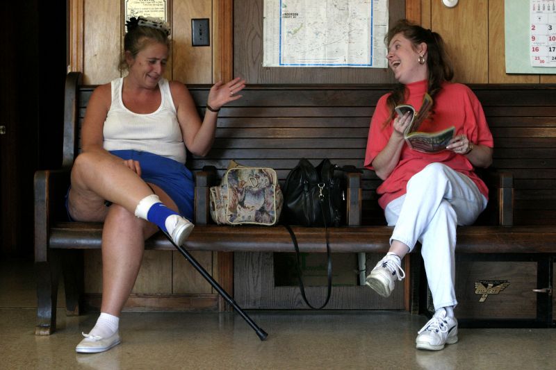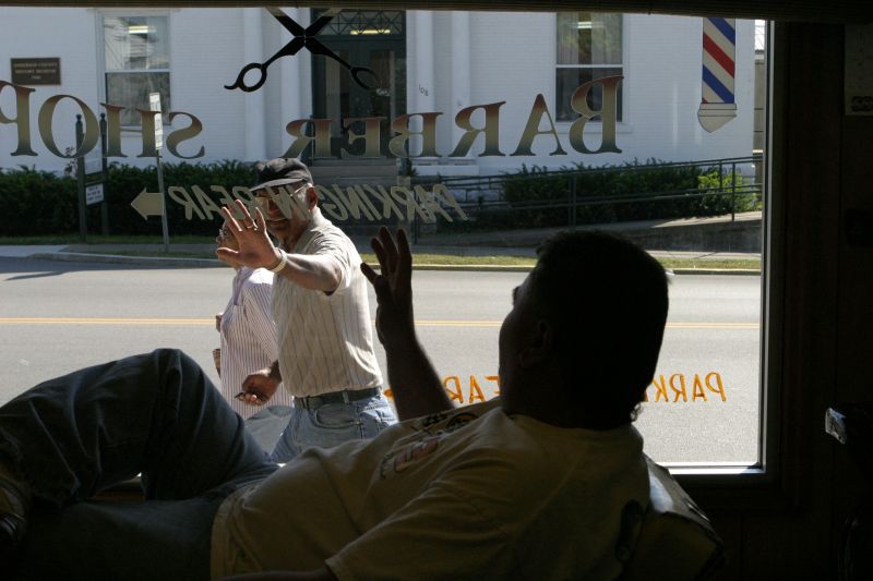 Billy Cox, owner of Lawenceburg Barber Shop, often lounges in his chair when business is slow and waves at friends and clients passing by. "Makes the day longer when it's slow in here," he said.Lynne Abbott, left, and her sister, Charlotte Wagoner, gossip in the Lawrenceburg Barber Shop about a boy with a mohawk they saw earlier in the day. "I don't know how he got his hair to stand up like that," Wagoner said. "It was aweful, his hair was a tall as mine is long." "He didn't have to dress up for Halloween," Abbott replied.
