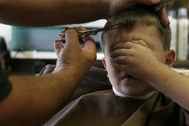 Jacoby Kinder, 6, protects his eyes from falling hair. According to his father Jamie, Jacoby hates getting a cut because hair irritates his eyes.