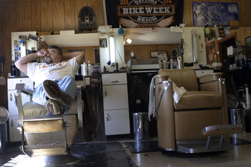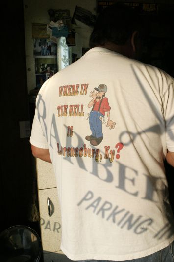 the hell is Lawrenceburg, KY?" Lawrenceburg Barber Shop owner Billy Cox relaxes and waits for customers. The shop is decorated with a blend of old fashion accessories and modern posters of motorcycle events.