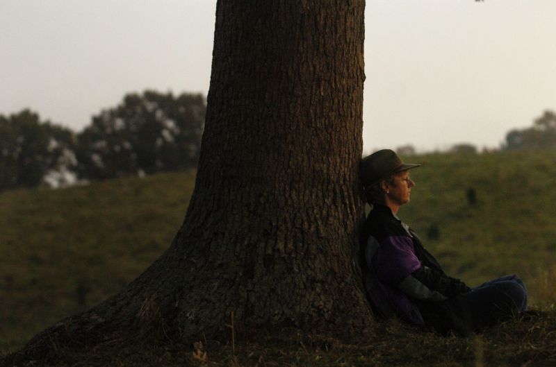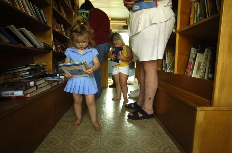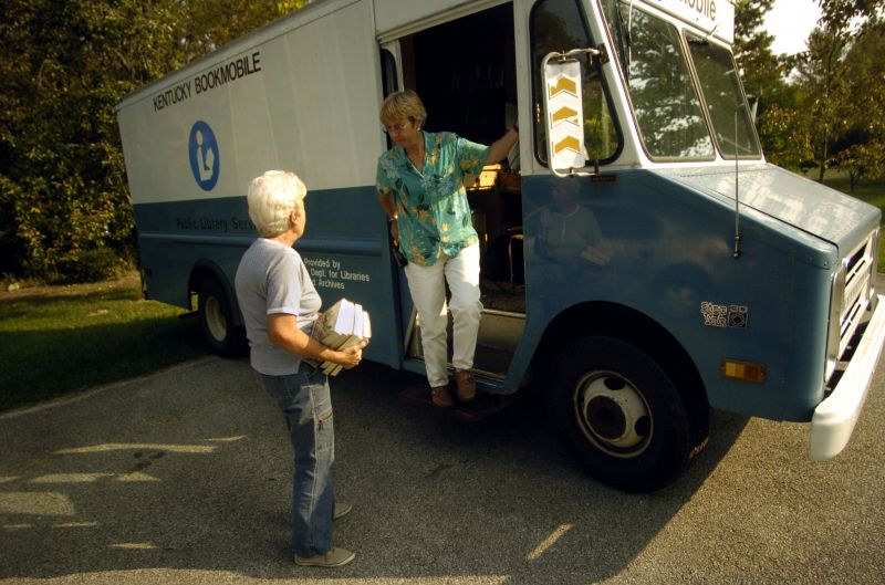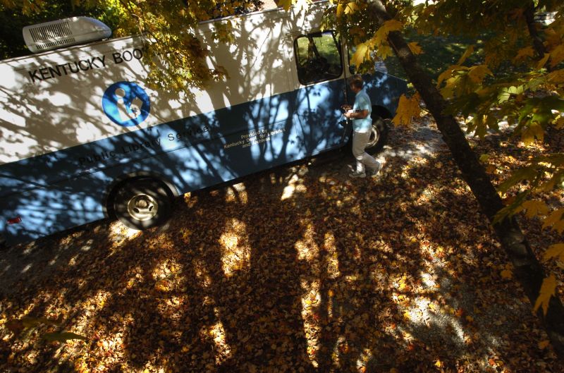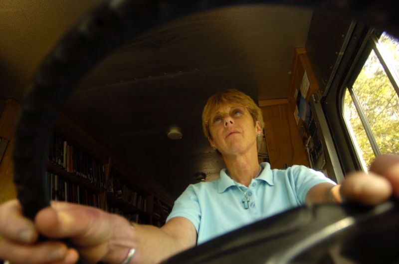 Fall colors and afternoon sunshine dapple the bookmobile as librarian Deborah Perry climbs aboard to head for the home of another appreciative Anderson County reader.Deborah Perry, Anderson County bookmobile librarian.Betty Steverson, left, talks with Deborah Perry, Anderson County bookmobile librarian, outside Betty's house just outside Lawrenceburg.Maneuvering the Anderson County bookmobile, a 14-foot-long 1985 Chevy van, librarian Deborah Perry begins her afternoon rounds.Allyson Agostinelli, 2, left, looks at a book she selected while her sister Alexandria, 3, hugs her book while standing next to their mother Kelly in the Anderson County Bookmobile.Children at the Little Angel Day Care in Lawrenceburg listen as Deborah Perry reads a Halloween story to them on Wednesday.Deborah Perry leans back against her favorite tree and watches the sun rise over the hills above the Crooked Creek valley.