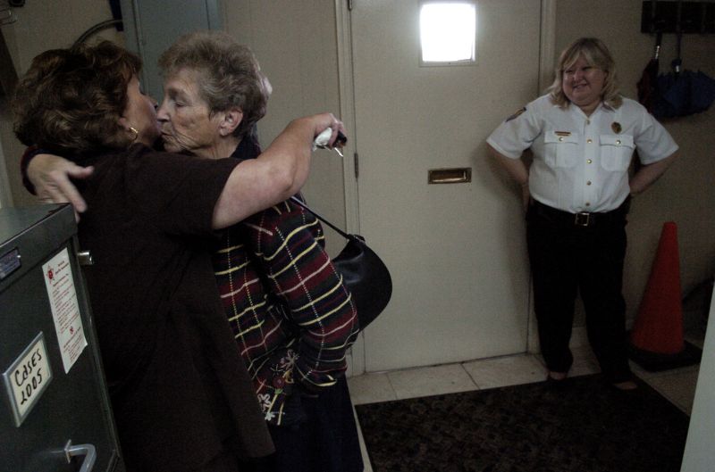 While a group of inmates wait for their hearing in court, inmate Lesha Curtsinger chats with Anderson County Jailer Joani Clark. Joani said Lesha and some of her family moved in from another county and have become well known to the Anderson County court system. Curtsinger was in court today facing charges of driving under the influence. Fellow inmates also in court were, left to right, Bill Crawford, Michael Clauley and Eric Wiggers.Donnie Spaulding, center, comforts Carolyn Crawford with a hug. Carolyn's son is in custody with Anderson County Jailer Joani Clark, right, on burglary and assault charges.