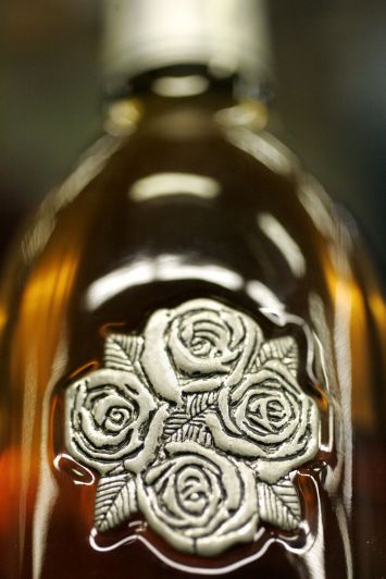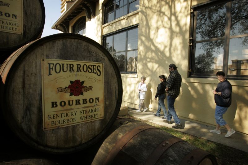 The Four Roses emblem on a bottle of Four Roses Super Premium bourbon at Cox's Creek warehouse. This product is one of two of the company's bourbons that are only available overseas.Mike Bullock, an employee at Four Roses's Warehouse Facilities, smells the aroma of a single barrel of bourbon at the warehouse in Cox's Creek. The sample is dilluted with mineral water for testing the aroma. If the smell is not up to par, it is not used for the special single barrel bottling.Agnes Parman (far left) leads Donna Rucker and Gary Parker, both of Berea, and Marlene Kaeding, of Nebraska, on a tour of Four Roses Distillery.