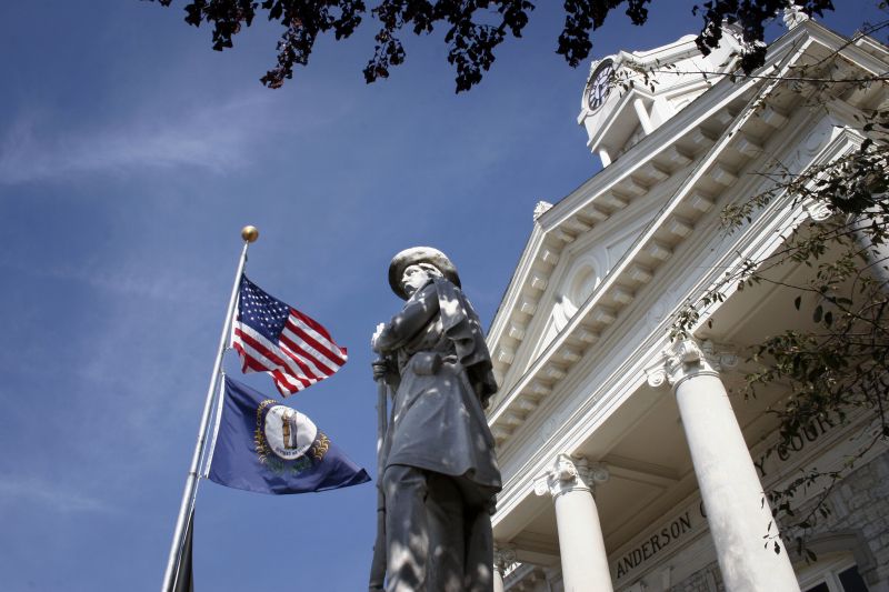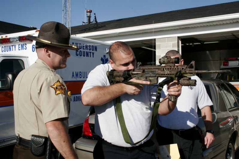Deputy Greg Boblitt, 35, says goodbye to his daughter Lauren, 4, before his 6:00 PM shift as his wife Autumn, 27, looks on.A Confederate monument stands in front of the Anderson County court house as a memorial to the four Infantries from Lawrenceburg who fought in the American Civil War.A Confederate monument stands in front of the Anderson County court house as a memorial to the four Infantries from Lawrenceburg who fought in the American Civil War.Unfortunately there is no info with this photo.Deputy Greg Boblitt, 35, checking for proper identification and registration on KY 151/Alton Rd. at a security checkpoint in Anderson County.Deputy Greg Boblitt, 35, refills his cruiser while on duty in Anderson County.Tactical Paramedic Wayne Briscoe, 27, handles Deputy Greg Boblitt's Bushmaster M4 Police Rifle during down time at the Anderson County EMS.