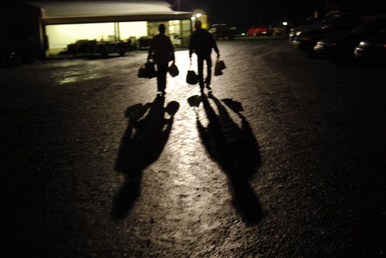 Nearly 450 feet below ground, rock dust fills the air as coal miners at the Elk Creek Mine in Hopkins County, Ky., break down a belt line previously used to transport coal. The walls are periodically treated to make them fireproof, a process that kicks up dust and makes it hard to see and breathe. At 11 p.m. at Elk Creek Mine in Hopkins County, Ky., Jarrett "Country" VanCleve, 21, and Ron "Indian" Rhodes meet in the parking lot and walk to meet their friends before starting their nine-hour shift underground. Jarrett VanCleve, 21, is glad to see his friends at the Elk Creek Mine in Hopkins County, Ky. Outside the shower room, the miners gather at the 11 p.m. shift change and are loud and horse around, despite the hard labor that they are about to do. Jarrett "Country" VanCleve, waits to start his shift at Elk Creek Mine. The miners go by their nicknames underground, a strong tradition to every miner. Breakfast is ready for Jared VanCleve, 21, when he comes home from the coal mine where he works third shift. Every morning, his mom, Benita "Cricket" VanCleve, waits for Jared to call and let her know he is safely out of the mine. "I worry about him. . . . It's hard for a mother to understand that when a child is grown, they get to choose what they want to do," she said. Jarrett VanCleve, 21, goes to church with his parents twice on Sundays and once on Wednesday at Nortonville Baptist Church. He lives for "the Lord, my family, and that coal mine," he said. Best friends and neighbors since they were little, Melissa Clayton, 18, and Jarrett VanCleve, 21, get to spend a few minutes together when Clayton comes home from Eastern Kentucky University, where she is a freshman. "He misses me like crazy," she said. Warm, October light streams through the foggy morning air off Island Ford Road in Hopkins County, Ky.