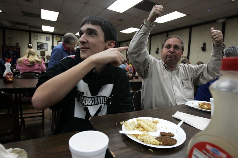 Josh Pruitt and his father Byron (R) joke with a friend about the upcoming World Series during a pancake dinner at the Madisonville Lions Club.