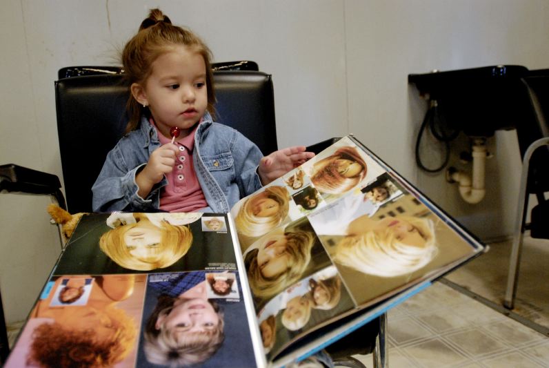 Kamarie Neal considers style options as she waits for her babysitter, Madisonville Beauty School student Charmi Slaton, to finish her shift in the school's salon.