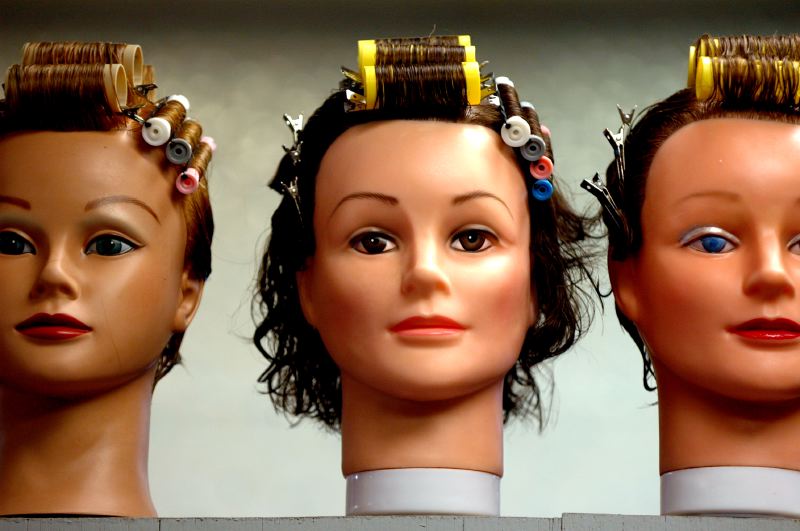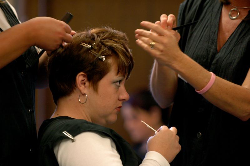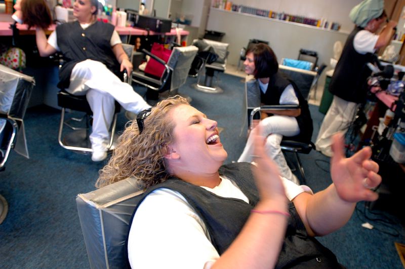 Pemberton is a resident of Madisonville and appreciates the low prices of the school, "and the girls are real nice too." October 19, 2006. Madisonville, Kentucky. Mike TerryMadisonville Beauty School student Lori Davis welcomes Carline Moore, a regular at the school's salon where work is done exclusively by students. October 20, 2006. Mike Terry.Heads of practice hair line the walls of the Madisonville Beauty School. Students must put in 300 hours of practice before they're permitted to cut paying customers' hair.