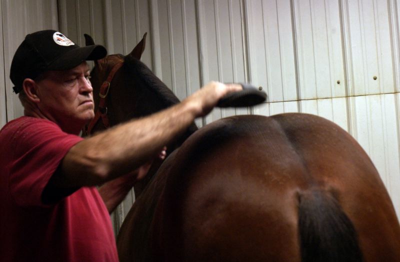 Horse trainer and breeder Jeff Staton, 52, takes a break from his work for a cup of coffee on his 75 acre ranch, Golden Hollow Farms. "You have gotta really love breeding horses, and I do," Staton said. Jeff Staton brushes his halter horse "Elusive" at Golden Hollow Farms. Staton spends xxx hours a day grooming, brushing and exercising 30 quarter horses and gaited horses at his farm. "These here are beauty contest horses," Staton said, smiling. Staton has owned and operated Golden Hollow Farms for 35 years with his wife Diane. For the quarter horses at Golden Hollow Farms, appearance is everything. The coat and the straightness of the legs are key to the horse competitions. Staton spends 8 hours a day grooming 30 horses in preparation for the yearly contests. Jeff Staton has a satchel filled with horse brushes, clippers, and hair polish inside his stables at Golden Hollow Farms in Madisonville Kentucky. Staton has been training and breeding quarter horses for 30 years.Jeff Staton wraps his mare "Call me Elusive's" leg for support before her daily exercise. Staton boards 30 quarter horses on his ranch Golden Hollow Farms. Staton has cared for some of the horses since they were born, but they belong to clients from all over the country. "The horses I have belong to others, but I treat them like they are my own," Staton said.