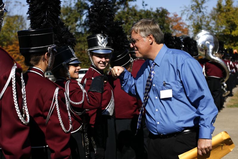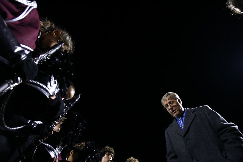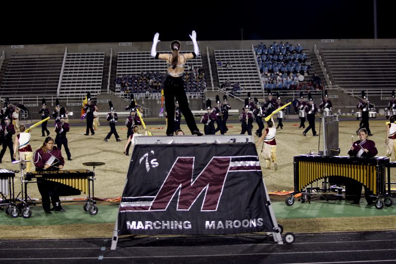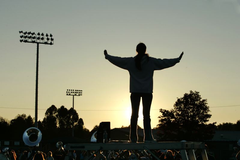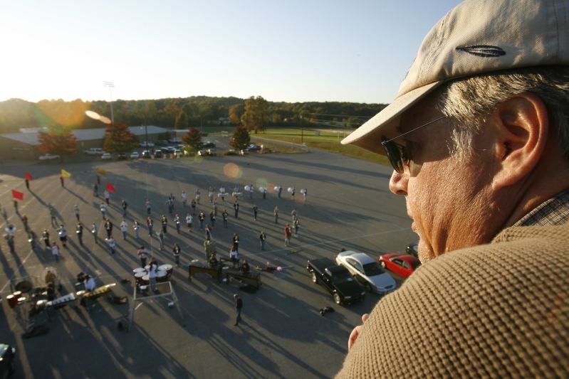 Band director, Rob Bryant, watches from a scissors lift as the Madisonville-North Hopkins High School Marching Band practice on the school parking lot in Madisonville, Ky. With regional competition in one week and state the next, the Marching Maroons have to work hard to repeat last year's state 4-A championship. In addition to their accomplishments in local competitions the band has been invited to perform at the Rose Bowl in 2007 and the Beijing Olympics in 2008.Madisonville-North Hopkins High School marching band director Rob Bryant encouraged each of his students before a competition at the Stadium of Champions in Hopkinsville. Madisonville-North Hopkins High School marching band director Rob Bryant reminds his students to watch their drum major during a Saturday morning competition at the Stadium of Champions in Hopkinsville. The Madisonville Maroons took third place in the preliminary class 4-A competition, but won Reserve Grand Champion in the overall competition.The Madisonville-North Hopkins High School Marching Band performs during the overall competition Saturday night (October 21, 2006) in the Staduim of Champions at Hopkinsville High School in Hopkinsville, Ky. The band won Reserve Grand Champions in the overall competition. Though second place is a disappointing finish for the band that won the state 4-A championship the year before.