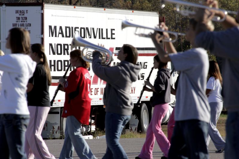 Unfortunately there is no info with this photo.Madisonville-North Hopkins High School marching band director, Rob Bryant, leads his band in prayer just before the band's second performance during Saturday evening (October 21, 2006) competition in the Stadium of Champions at Hopkinsville High School, in Hopkinsville, Ky. The Madisonville Maroons ended up taking a disappointing third place in the mornings preliminary class 4-A competition but went on to win Reserve Grand Champion in Saturday evenings overall competition.Madisonville-Hopkins North High School marching band director, Rob Bryant, his daughter, Kelsey, and wife, Caroll, visit with friends while at dinner Thursday evening, October 19, 2006 in Madisonville, Ky. The Madisonville Maroons won the state 4A championship last year and are working toward repeating this year. In addition to their accomplishments in local competitions the band has been invited to perform at the Rose Bowl next year and the Bejing Olympics in 2008.Drum major Whitney Davis leads the Madisonville North-Hopkins High School marching band practice Friday evening (October 20, 2006) in Madisonville, Ky. With regional competition in one week and state the next week, the Marching Maroons have to work hard to repeat last year's state 4-A championship. In addition to their accomplishments in local competitions the band has been invited to perform at the Rose Bowl next year and the Beijing Olympics in 2008.Madisonville-Hopkins North High School marching band practices Friday afternoon, October 20, 2006 in Madisonville, Ky. The Madisonville Maroons won the state 4A championship last year and are working toward repeating this year. In addition to their accomplishments in local competitions the band has been invited to perform at the Rose Bowl next year and the Bejing Olympics in 2008.Unfortunately there is no info with this photo.