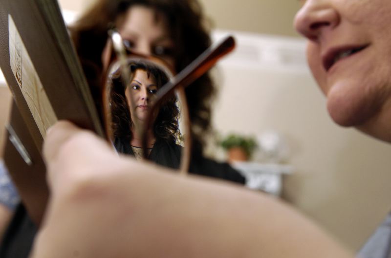 Robin Mohon (right), 44, of Central City, Ky, looks to set up an appointment following a color treatment by Terri Cox (left), 39, of Madisonville, Ky, at Snooty Fox beauty salon in Madisonville.