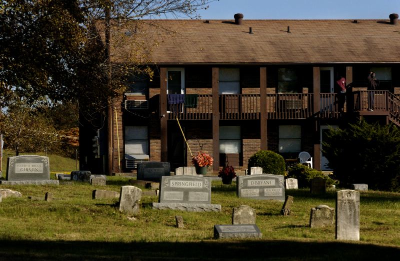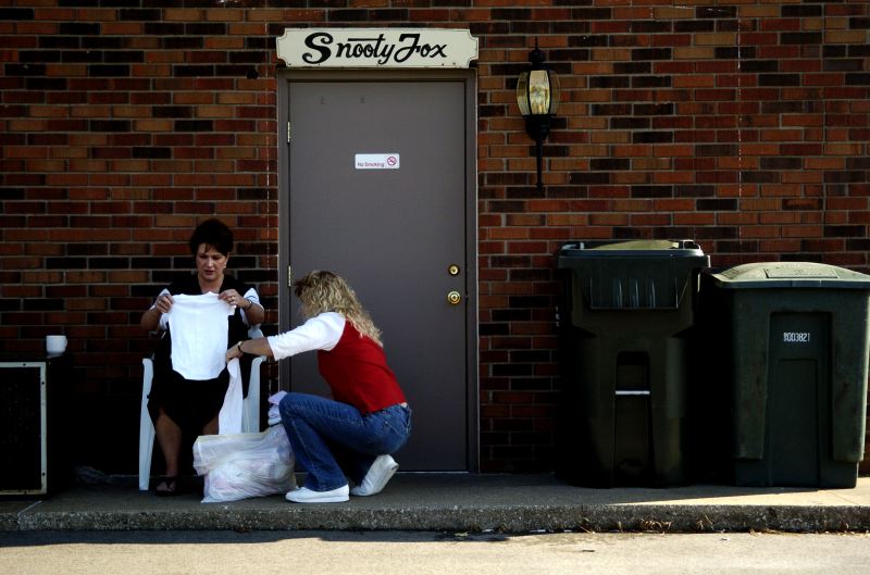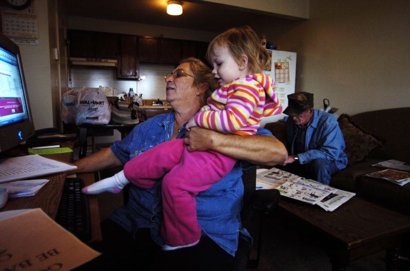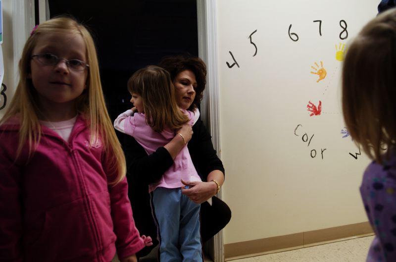 Elizabeth Cox, 4, of Greenville, Ky, clings to her mother, Terri (right), 39, while wanting her to stay longer as she is dropped off at Nanny's House day care in Greenville before heading to work for the day at Snooty Fox beauty salon in Madisonville where she works as a hair stylist. Terri Cox (left), 39, of Greenville, Ky, looks through a bag of baby clothes brought in by co-worker, Jamie Smith, 46, of Nortonville, Ky, to give to her twin 8 month girls, Emma and Olivia, while taking a break between appointments at Snooty Fox beauty salon in Madisonville where she works as a hair stylist. Just past Elliot Memorial Gardens cemetary in Madisonville, Ky, lies G&G&Sons apartment complex, a place where many call home and have come from several backgrounds to form a "family". Georgia Gilbert hoists her grandaughter, Katelyn, 2, of White Plains, Ky, on her shoulder as she surfs the internet in the office of G&G&Sons apartment complex in Madisonville that she owns along with her husband, Gerald (right), while babysitting her for their daughter-in-law. The Gilberts, originally of Exeter, CA, moved to Madisonville after returning a borrowed car for her mother to Kentucky. Gerald quit his job and retired after they found a house in Kentucky and shortly after they purchased the buildings.