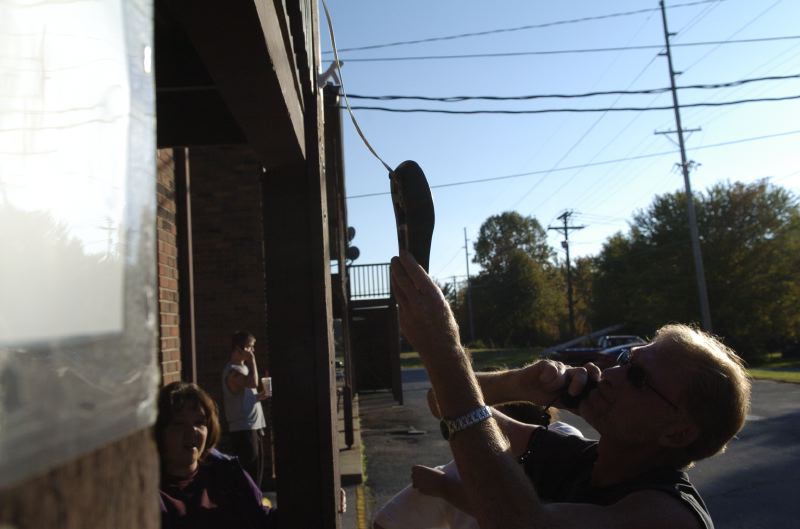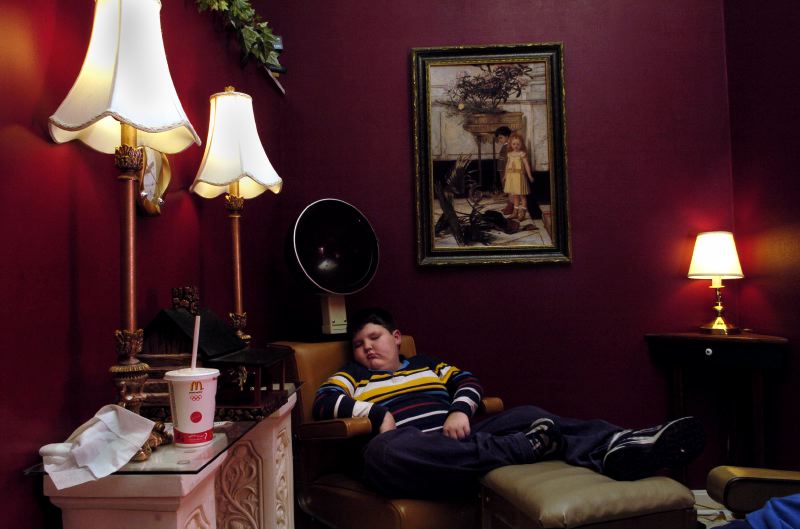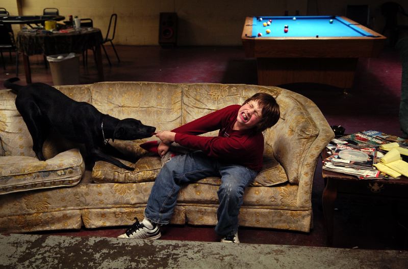 G&G&Sons apartment complex maintenance technician, Keith Riley, makes a phone call to his mother from a neighbors phone fished over the second story balcony. "It's down to earth," said Riley about the complex. "No one tries to be better than anyone else. We're here all making a living...getting by."Bryan Hill of Madisonville naps under a hair dryer to after getting his hair cut. Bryan, 8, was waiting for his mother and grandmother to finish their hair appointments at the Snooty Fox beauty salon. Ethan Brown, 10, of Belton, Ky., wrestles his shirt sleeve away from 1 -year-old Labrador, Abygus (aka Gus) while hanging out in Gus's Sports Club in Madisonville Friday evening. The 24-hour sports club, owned by his father, David, and the dog's name stem from a dog previously owned by David. "(The dog) is the manager," says Ethan, who hangs out at the business with the two every weekend. "It's kind of my dad's dog but she loves me more than she loves him."