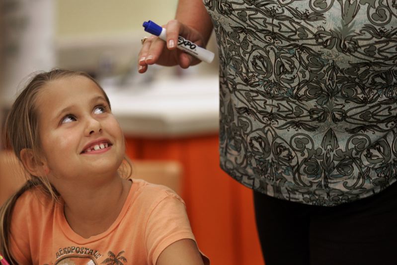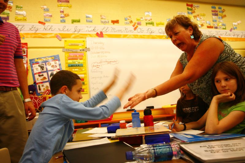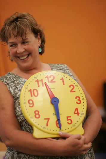 French teaches telling time in five-minute intervals during math class on Thursday, Oct. 19, 2006. When a student in Tammie French's class does something right, happiness radiates from her. "Giving kids the love and encouragement they need is an important part of the learning process," French said. During her quarter of a century as an educator, a responsibility French takes seriously, she has seen hundreds of children come through her classroom. "I try to teach my kids the way I would want my daughter to be taught," Tammie French said. "It's so great to see a child get it," Tammie French said. Thomas Couchman, 8, high-fives his teacher after getting an answer right during math class on Thursday, Oct. 19, 2006. French was awarded teacher of the year by her co-workers, students, and parents of students for 2006 at Hanson Elementary. During her quarter of a century as an educator, a responsibility French takes seriously, she has seen hundreds of children come through her classroom. "I try to teach my kids the way I would want my daughter to be taught," Tammie French said. Hanson Elementary third grader Kyndal Taylor listens attentively as Tammie French winds prepares to start the day before the pledge of allegiance on Thursday, Oct. 19, 2006. During her quarter of a century as an educator, a responsibility French takes seriously, she has seen hundreds of children come through her classroom. "I try to teach my kids the way I would want my daughter to be taught," Tammie French said. (Jonathan D. Woods)
