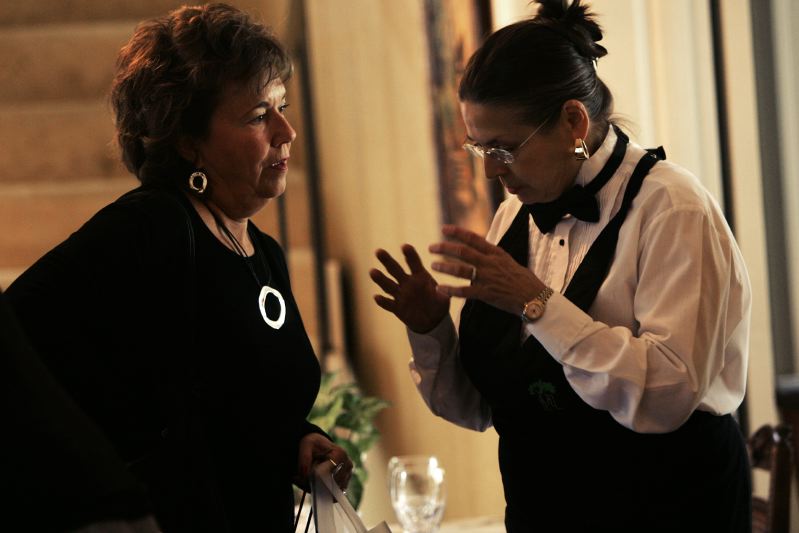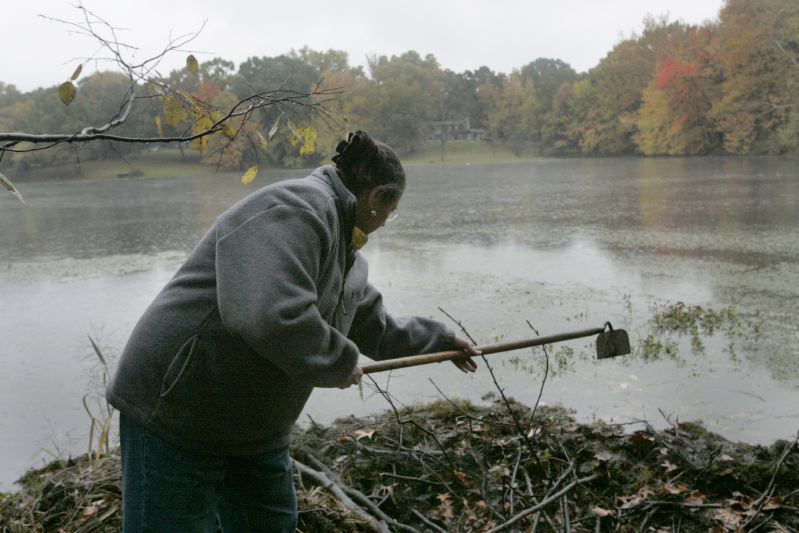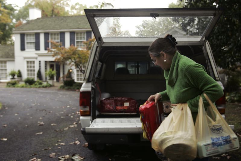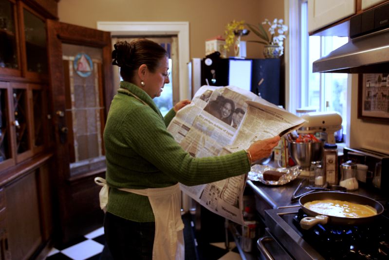 While waiting for the eggs to cook, Shirley Thomas reads the obituary page in the local paper, at the Hammock-Moore House, Thursday, Oct. 19, 2006. Thomas, and her husband, Joe, own two bed and breakfast inns. Hands full of groceries and a bag of dog food, Shirley Thomas closes the gate of her pickup outside her Madisonville home and bed and breakfast inn, Ruby Lodge, Thursday, Oct. 19, 2006. Thomas prepares for a bridal luncheon hosted by the Lodge. Her and her husband, Joe, an antique collector, bought the 74 acre land, which includes a lake, two years ago. Shirley Thomas digs out a beaver dam that blocked a creek causing the lake water to rise two feet, behind Ruby Lodge at Spring Lake, Friday, Oct. 20, 2006. Thomas and her husband, Joe, own two bed and breakfast inns. "I have my to-do list and I have his," she says, while her husband is away at a gun show. Now the list includes preparing a 24-person luncheon, running a restaurant, managing 24 rental units in town, and digging out a beaver dam. Shirley Thomas goes over details of a dinner party with Laurie Cox, who will host a rehearsal dinner for Cox's daughter, at the Ruby Lodge, Saturday, Oct. 21, 2006. Thomas and her husband, Joe, own two bed and breakfast inns in Madisonville. As a bridal luncheon disperses, Shirley Thomas laughs while catching up with friend Libby Bacon, left, at the Ruby Lodge, one of two bed and breakfast inns she and her husband, Joe, own, in Madisonville, KY, Saturday, Oct. 21, 2006. Thomas prepared and cooked for a party of 24 people, which included homemade quiche, cinnamon rolls, and banana and cranberry breads.