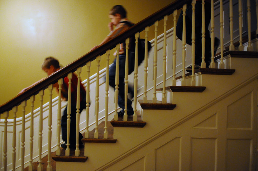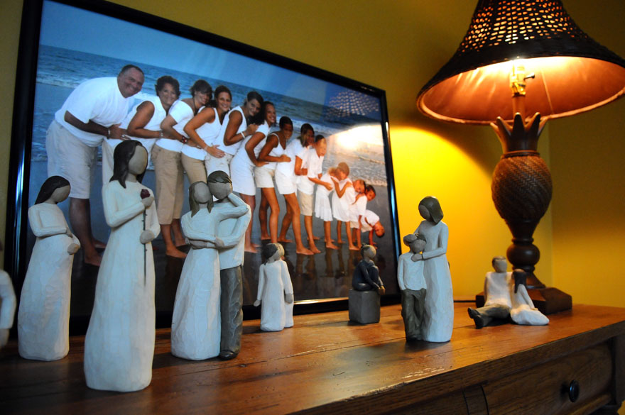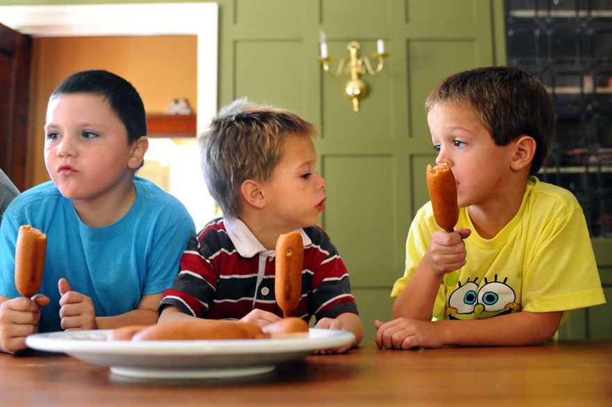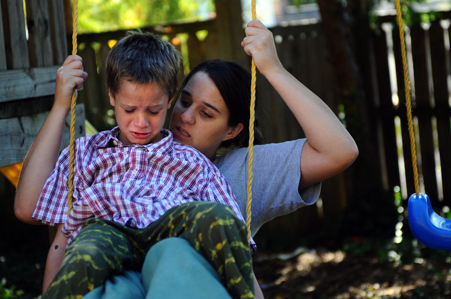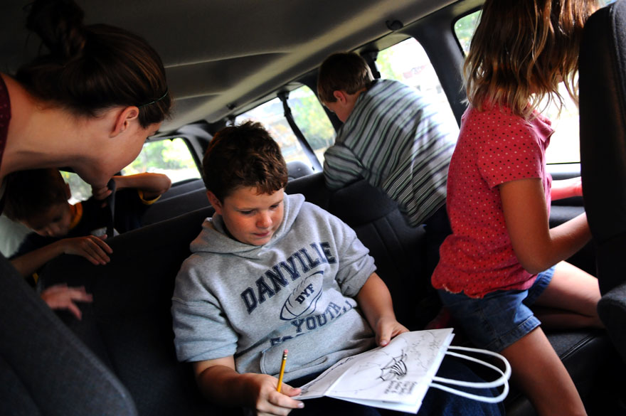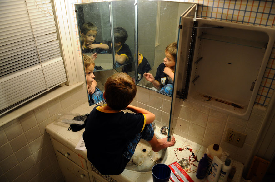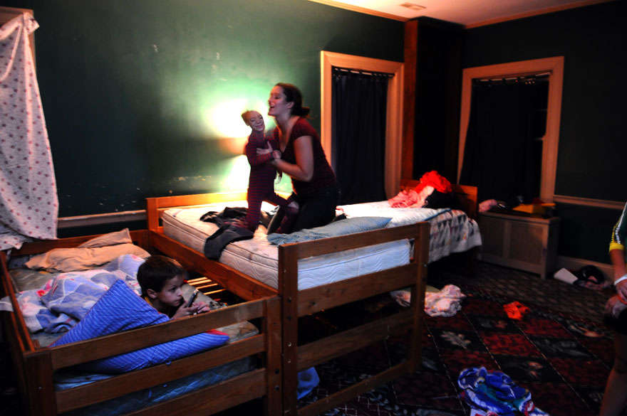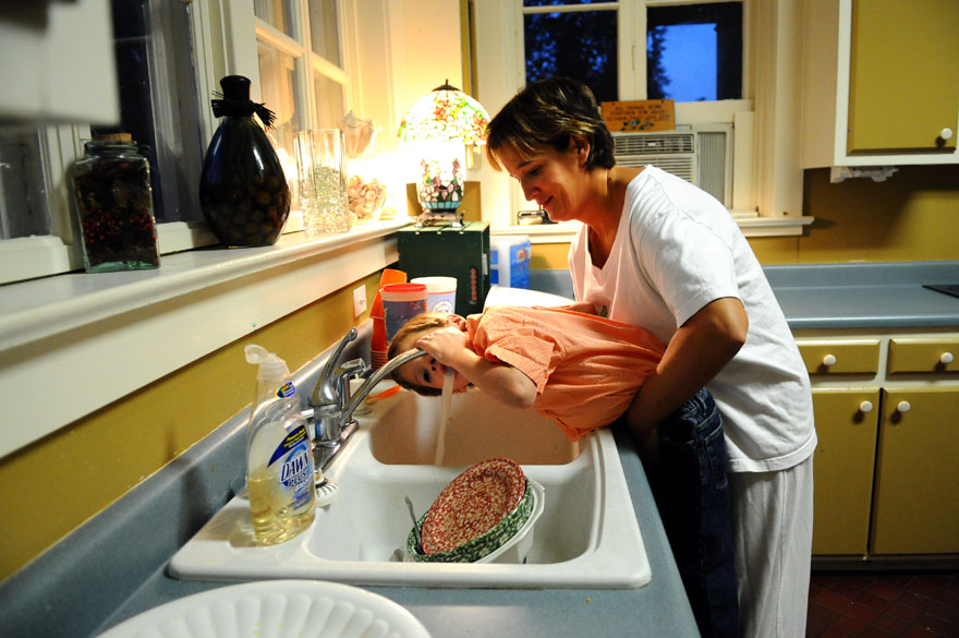 Jaxsyn Wood, 5, is avoiding "hot lava," which is a game he likes to play with his siblings in his family's Dannville home. Jackson, one of 11 children, was helping while the family was in the kitchen making dinner.A family photo sits on a table in the living room along with figurines that represent the thirteen members of the Wood family. Jackson Wood, 6, climbs an extension cord up his family's back deck at their home in Danville, Ky.Brayden Wood, 7, finds himself more interesting than his pillow after lights out by talking to his reflections. Brayden is one of a family of 13 that lives in Danville, Ky.Courtney Wood, 17, helps tuck in her youngest brother, Jaxsyn, 6, with hugs and kisses at their home in Danville. Corbin Wood, 10, of Danville the oldest son in the Wood family sits patiently while the family fills the van for their trip to Wal-Mart. In a hurry, mom Rhonda Wood of Danville is helping her youngest son, Jackson, 6, rinse his mouth out after brushing his teeth before school heading to school.Courtney, 17, and Lawsyn, 8, of Danville swing in the back yard as she consoles him about a confrontation he had with his older brother just a little earlier. Brayden Wood, 7, right, Jaxsyn Wood, 6, and Jade Parker, 6, eat corndogs for lunch at the Wood home in Danville. Three of the 11 children from the Wood family race to meet their mom at the family van so they can arrive to school on time.