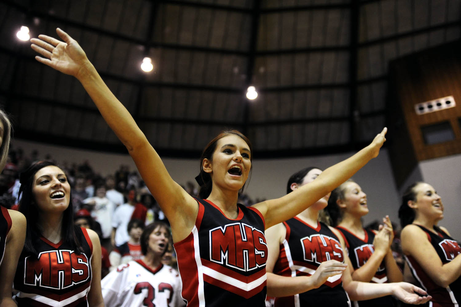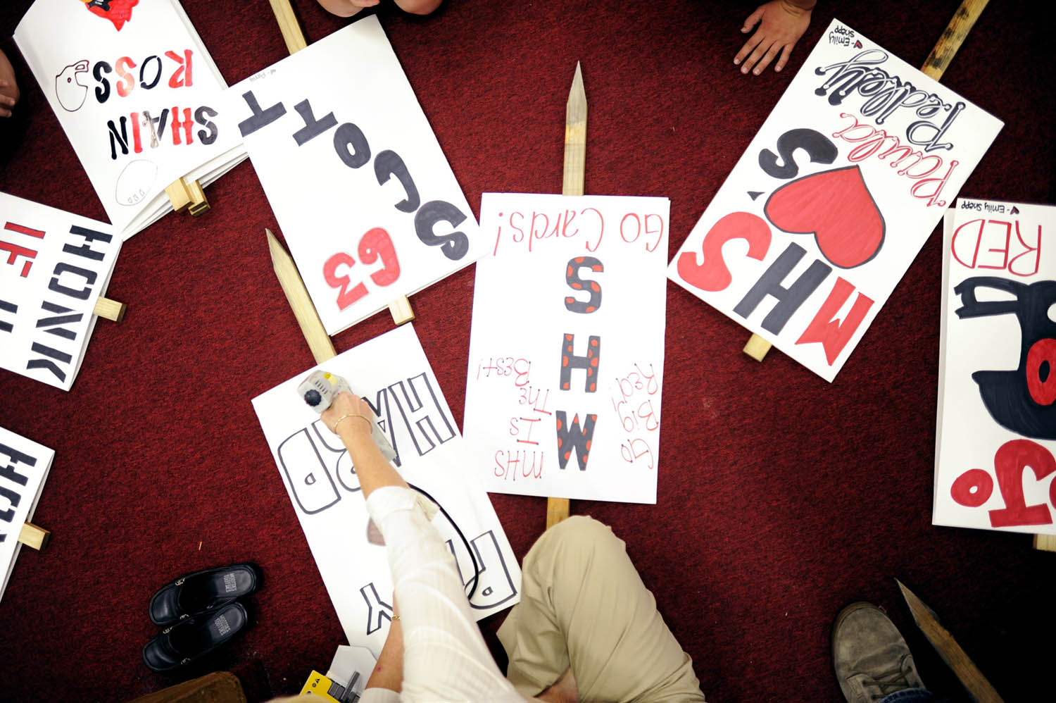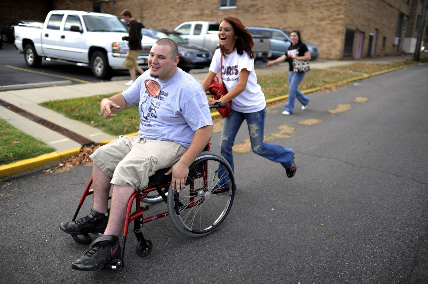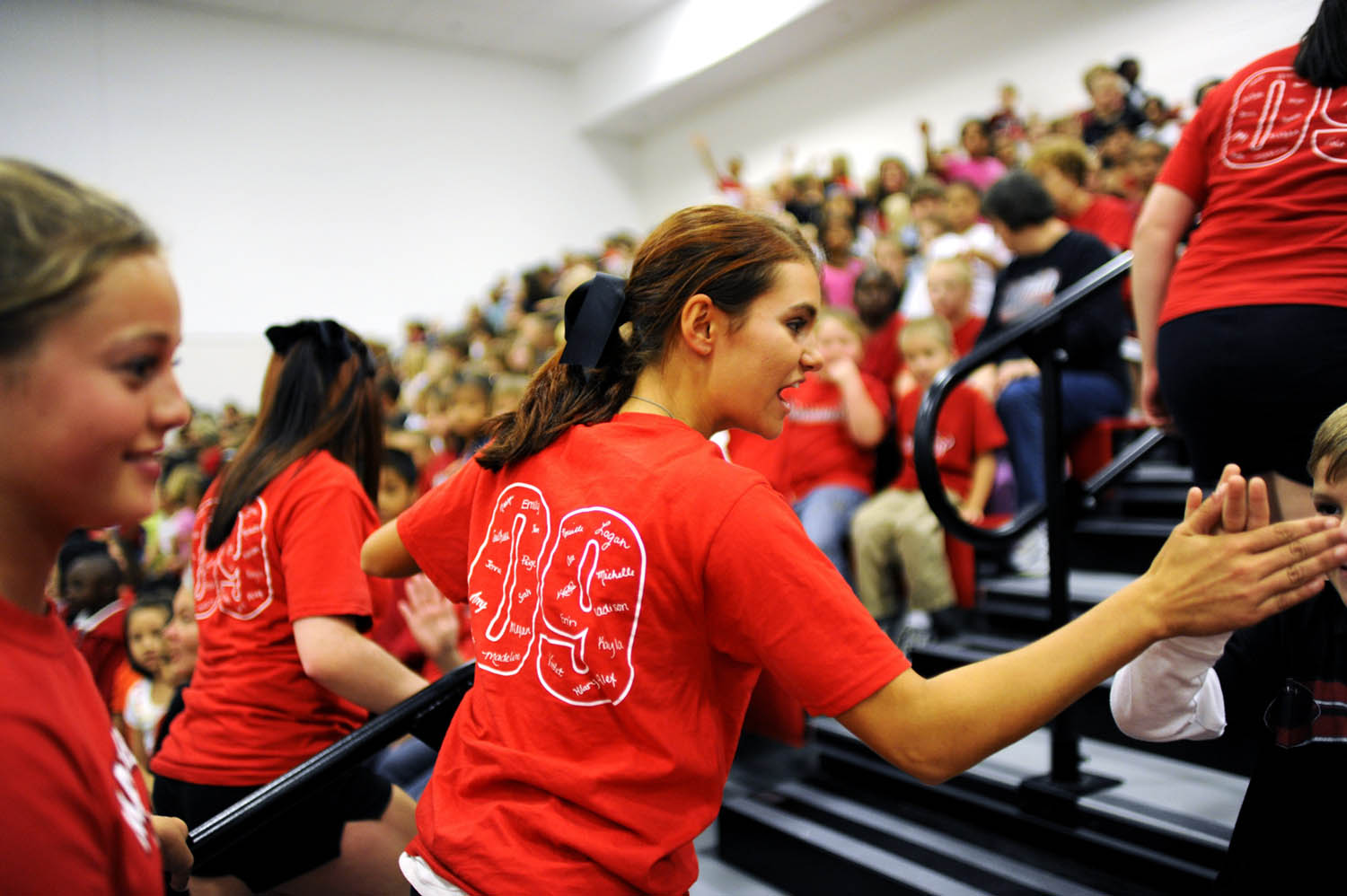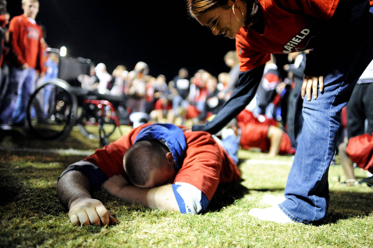 Unfortunately there is no info with this photo.Mayfield senior cheerleader Alex Adams socializes with friends Marielle Faraome, right, and Tony Njornge, second from left, during lunch on Oct. 1, 2008, "Decades Day" during spirit week at Mayfield High School. Spirit week aims to boost school spirit in anticipation of the Mayfield-Tilghman rivalry game on Friday night. Need name of girl at leftMayfield High School senior Alex Adams pushes long-time friend "Big John" Stevens down the street to his car after the senior football and cheerleading dinner at First Baptist Church on Wednesday, Oct. 1, 2008, in downtown Mayfield. Stevens suffered a spinal stroke during football practice in his freshman year and was told he would "never walk again," yet he has recovered greatly. He walks with crutches and, still a great part of the Catdinals family, attends every Cardinals football game.Alex Adams talks on her new cell phone at lunch during school on Wednesday, Oct. 1, 2008.Mayfield High School cheerleaders prepare yard signs for individual members of the Mayfield Cardinals football team after school on Wednesday, Oct. 1, 2008, in preparation for Mayfield's Friday night rivalry game against Tilghman High.Cheerleader Alex Adams gives high fives to students at Mayfield Elementary School during the "Beat Tilghman" pep rally at the school on Thursday, Oct. 2, 2008.Unfortunately there is no info with this photo.Unfortunately there is no info with this photo.