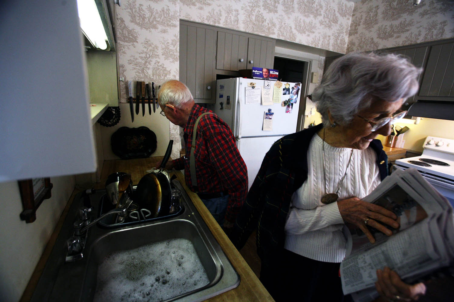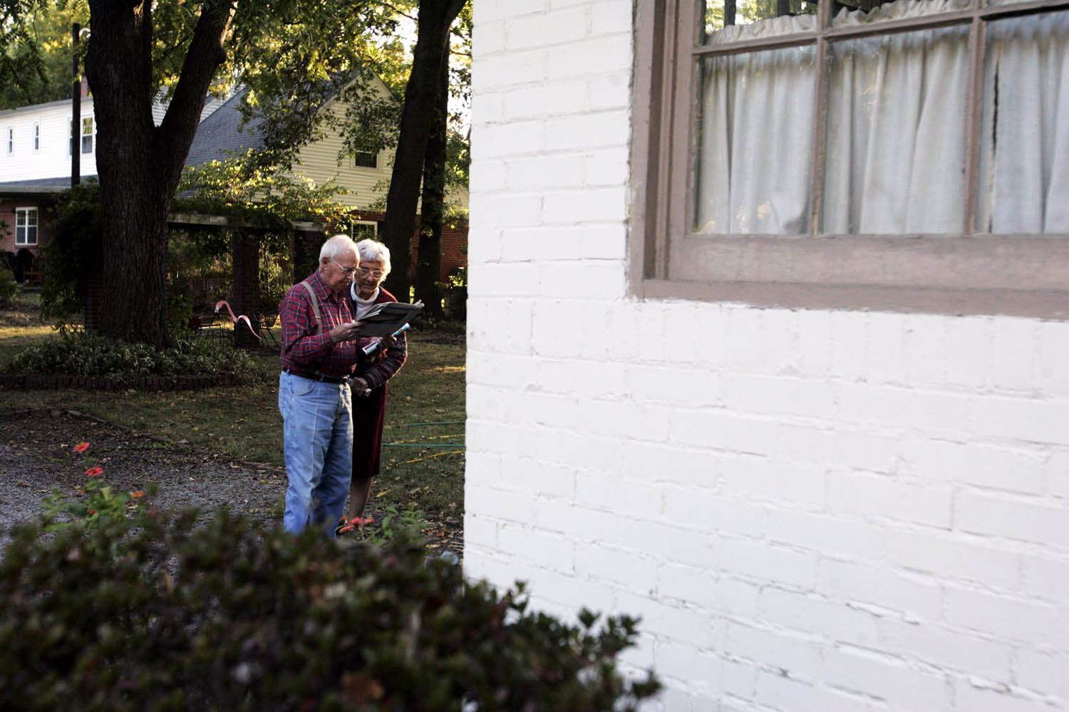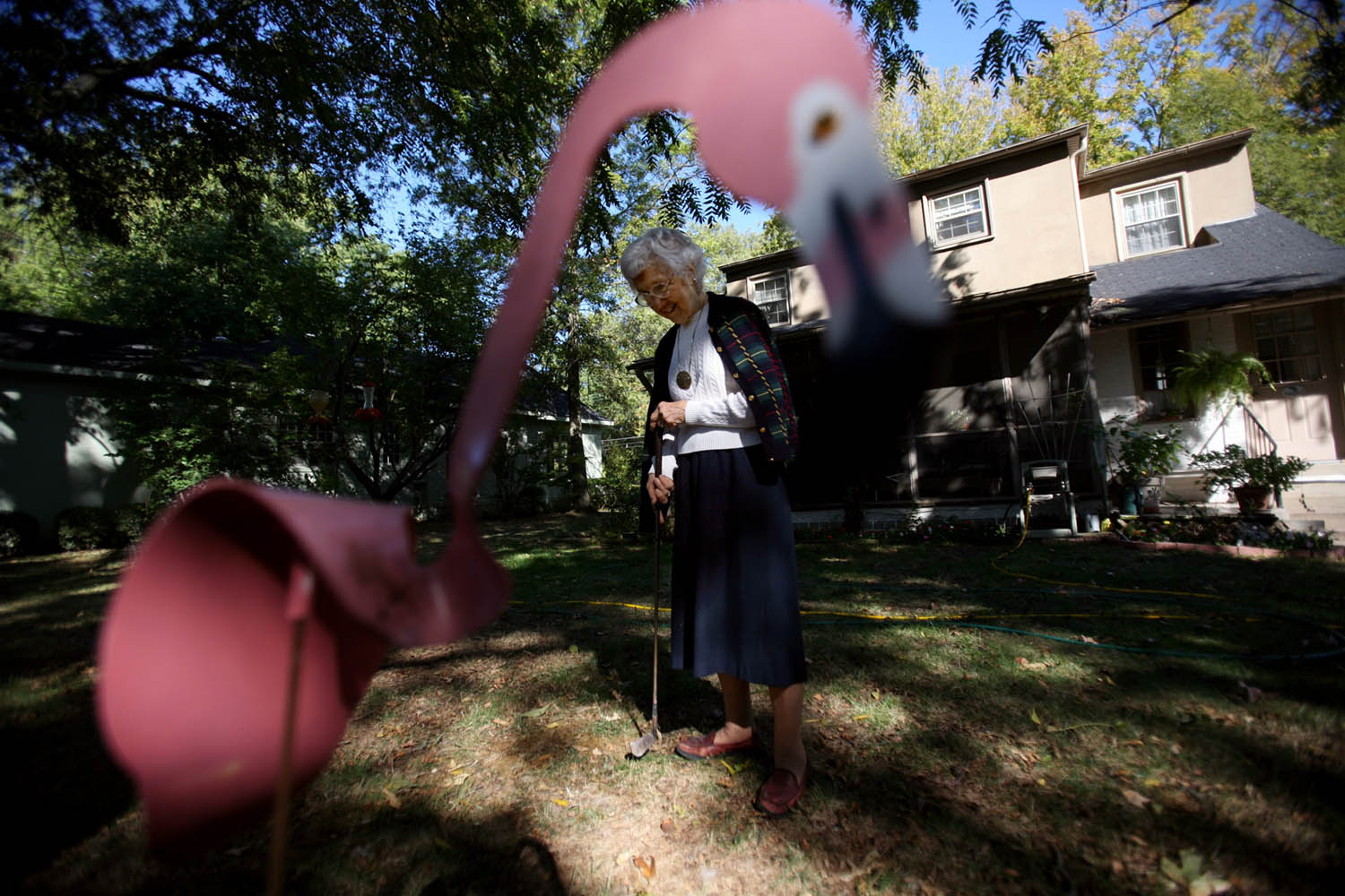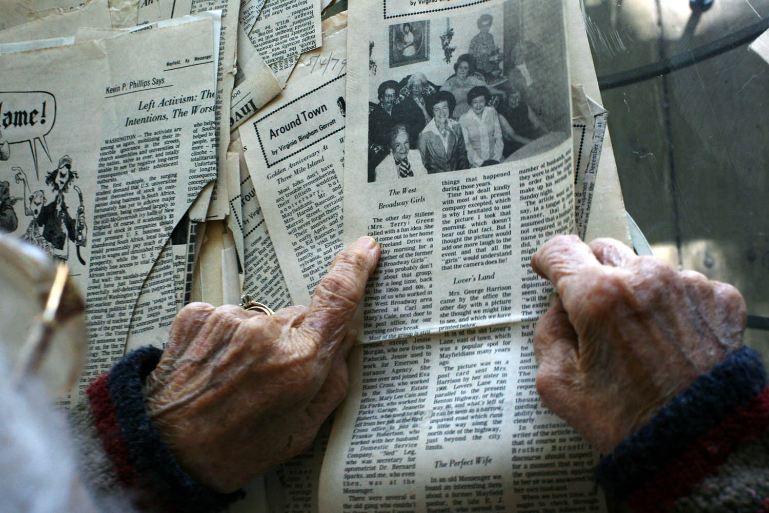 Virginia Garrott uses a golf club to roll walnuts to the trunk of the tree in her backyard. Virginia Garrott reads the morning paper over breakfast with her husband, Dan, in their Mayfield home.Virginia Garrott looks through newspaper columns she wrote for the Mayfield Messenger several decades ago. Virginia Garrott hugs her daughter-in-law Joyce Garrott, who came to visit with her husband from Cadiz. Virginia Garrott sweeps leaves in front of her house. Virginia Garrott says her life is filled with community evolvement and friendships. "There is always something to do in the town of Mayfield, if you want to do it," she said.Unfortunately there is no info with this photo.Virginia Garrott gets her hair done by hairdresser Carolyn Copeland at Sidney's Styling Salon in Mayfield.Unfortunately there is no info with this photo.Virginia and Dan Garrott read the newspaper in the backyard of their house.