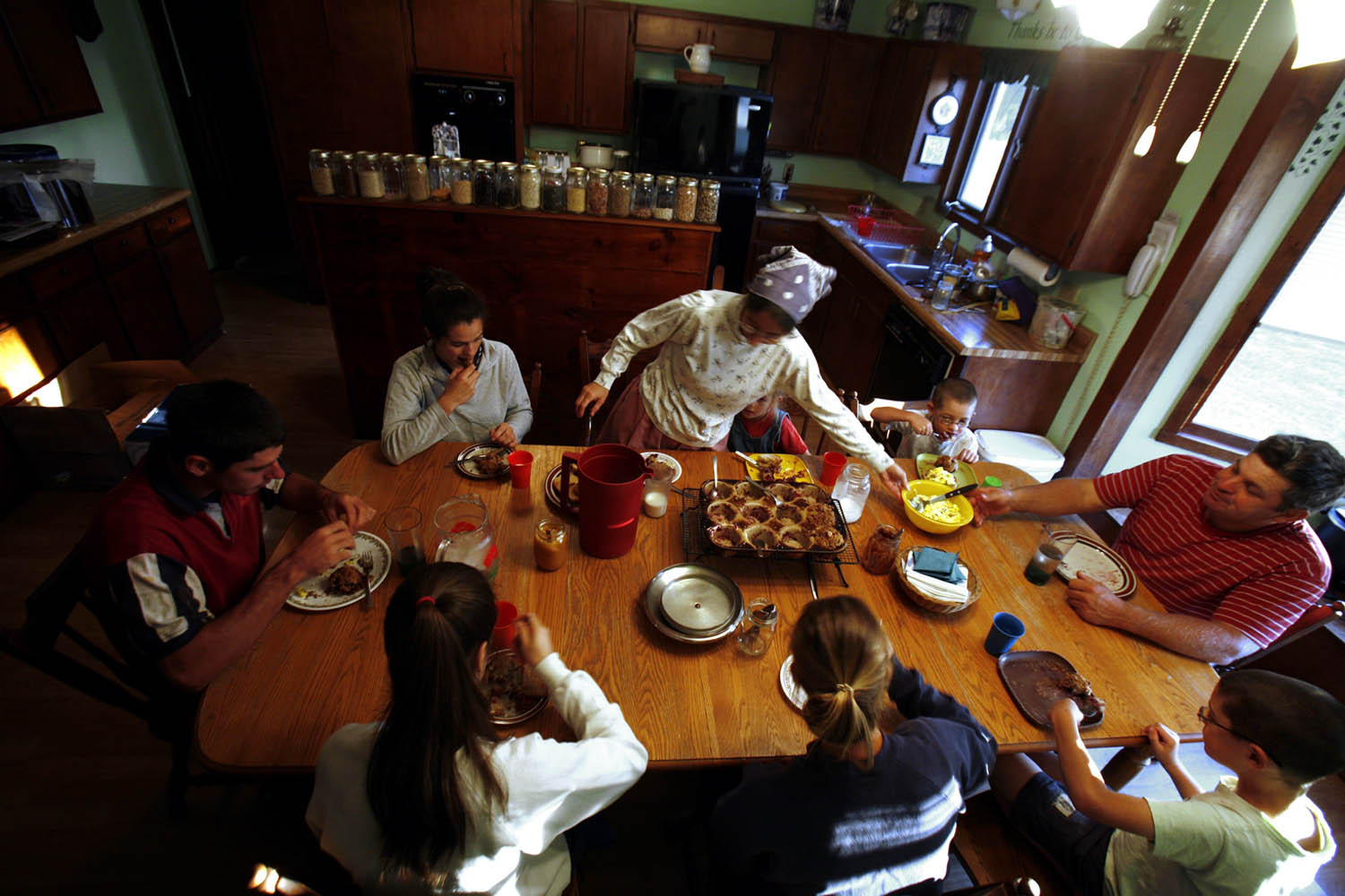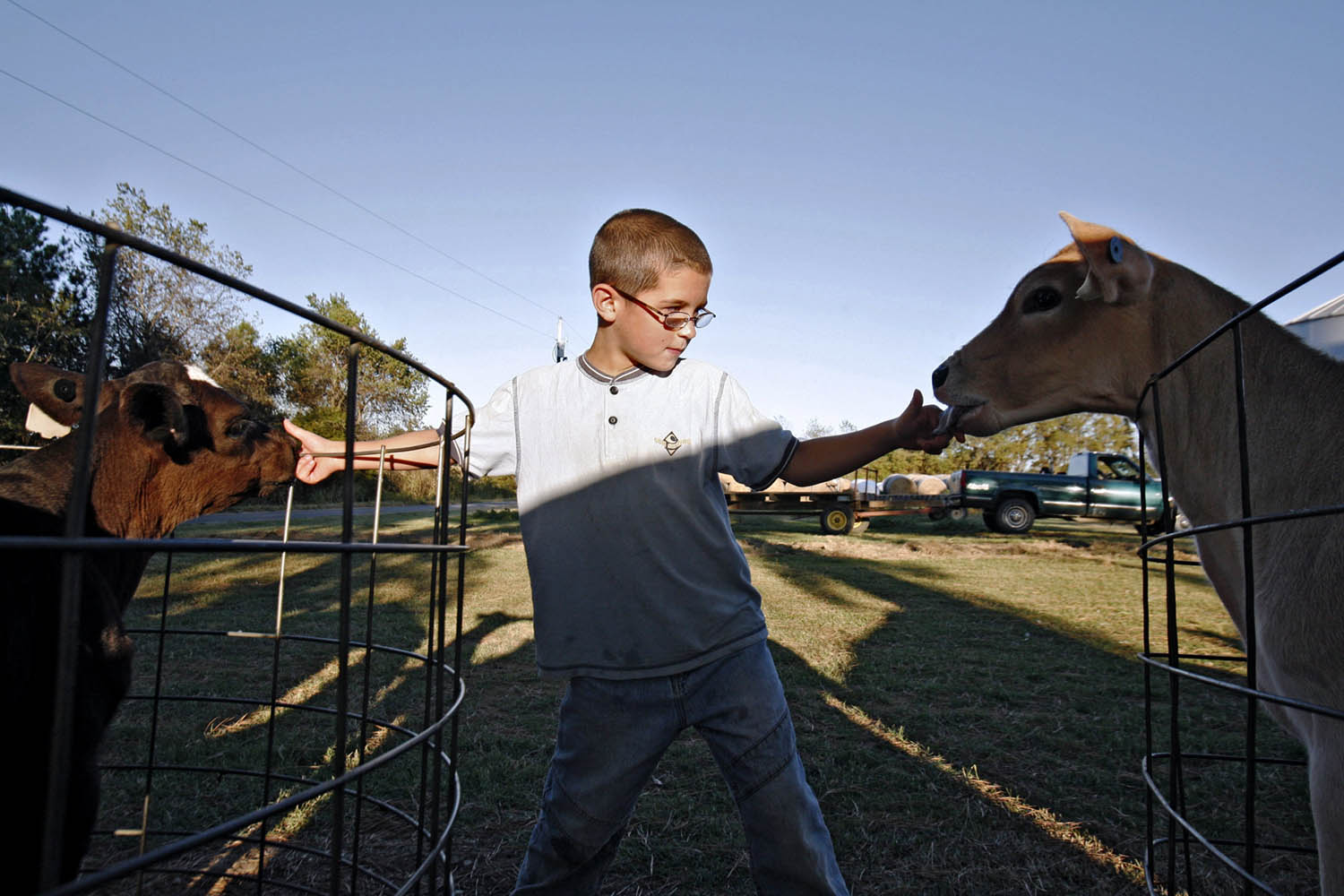 Even though Terry Trout decided to primarily breed and raise cattle for dairy production, he's open to taking on new opportunities. "I thought it would be good to have a fresh turkey for Thanksgiving," Terry said.Johannah Trout, 2, left, lends a hand to her brother Jesse Trout, 5, as he pulls a wagoon of milk over to the calf pens.Cindy Trout puts Johannah's hair in a pony tail before calling the family to breakfast at their dairy farm near Sedalia. "I don't get involved with the cows," she said. Josiah Trout, 7, lets calves suckle his fingers to calm them while an escaped calf is corralled. The Trout family has a dairy farm near Sedalia.The Trouts' three youngest children accompany Cindy Trout as she hauls bales of sorghum to be stored. Josiah, 7, Jesse, 5, and Johannah, 2, review phonics cards while waiting for the trailers to be loaded and emptied. All the children are home-schooled.As a long day of work comes to a close, Cindy Trout and her youngest daughter, Johannah, 2, make their way into the house for dinner.Terry Trout is greeted by his daughter, Johannah, his wife, Cindy, and his son, Jesse, as he drives down Howard Road after spending the afternoon cutting hay.A good drying day on Fountain Fresh Farm, a 173-acre dairy operation near Sedalia. Terry and Cindy Trout moved there from Maryland four years ago. (2008 Kyle Kurlick / The Mountain Workshops)Every morning, the Trouts spend time together praying and reading through a chapter of the Bible. Cindy Trout, center, reads some verses while her children Johannah, 2, and Tyler, 19, follow along.