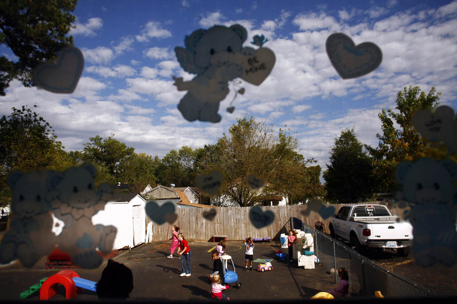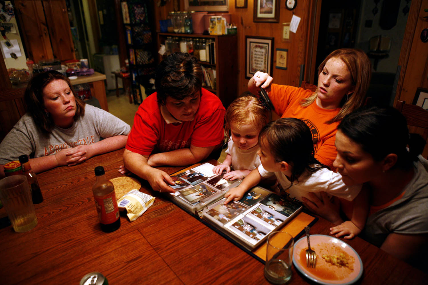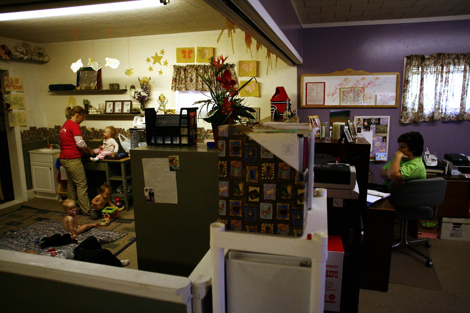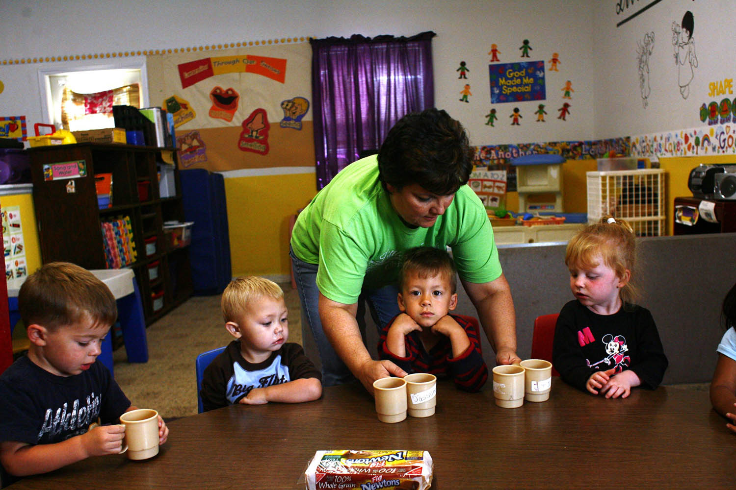 Lisa West serves refreshments at snack time to, from left, Isaac Fultcher, Joseph Mcgee, T.J. Childress, Raegan Manning and Adriana Garcia at the Little Angels Day Care in Mayfield. Lisa owns and operates the day care. She is assisted by her three daughters, and the day care center is attended by her four grandchildren. Lisa believes that her day care is more of a ministry as she teaches the children to believe in the ways of Christianity and said, "I believe that God is a constant, and I want these kids to think of me as someone they can always count on," she said.Toys, bicycles and other things fit for a child fill the playground at Little Angels Day Care.While Lisa West, right, fills out insurance forms, her daughter, Marisa Manning, changes diapers in Little Angels Day Care.Kierney Wilson, 3, bottom, and Kiley Engard, 3, take their naps at Little Angels Day Care in Mayfield. The day care center is operated by Lisa West, assisted by her three daughters. Lisa West, 49, left, volunteers at her church, First Assembly of God. When Angela Hornback, right, said she is having trouble in her life, Lisa asked her, "Need a prayer? We give those away for free."Lisa West, 49, center, attempts to control one of her day care charges, Robert Halvorson, 4, while she and her granddaughter, Madalie Fletcher, 3, read a story for the day's class.Lisa West hangs another photo on her "Girl's Wall" at home. Lisa likes to hang pictures of her children and grandchildren all over the house, from the kitchen to throughout hallways.Three generations of the West family gather around the table after dinner to show the youngest of the group, Raegan Manning, 2, and Madalie Fletcher, 3, pictures of their mothers, Marisa Manning, 20, second from right, and Maranda Fletcher, 26. Xxzxxx xxxx, left, and grandmother Lisa West observe.Lisa West takes advantage of a good photo opportunity as she sees her granddaughter, Riley Manning,1, sitting on a baby toilet for the first time. Her daughter, Marisa Manning, helps Riley balance.Lisa West experiences a restful moment she rarely gets because of her busy schedule of running a day care, center, teaching Bible studies, running a church food bank and surrounding herself with children throughout the day. Her relaxation still involves her granddaughter, Madalie Fletcher, 3.