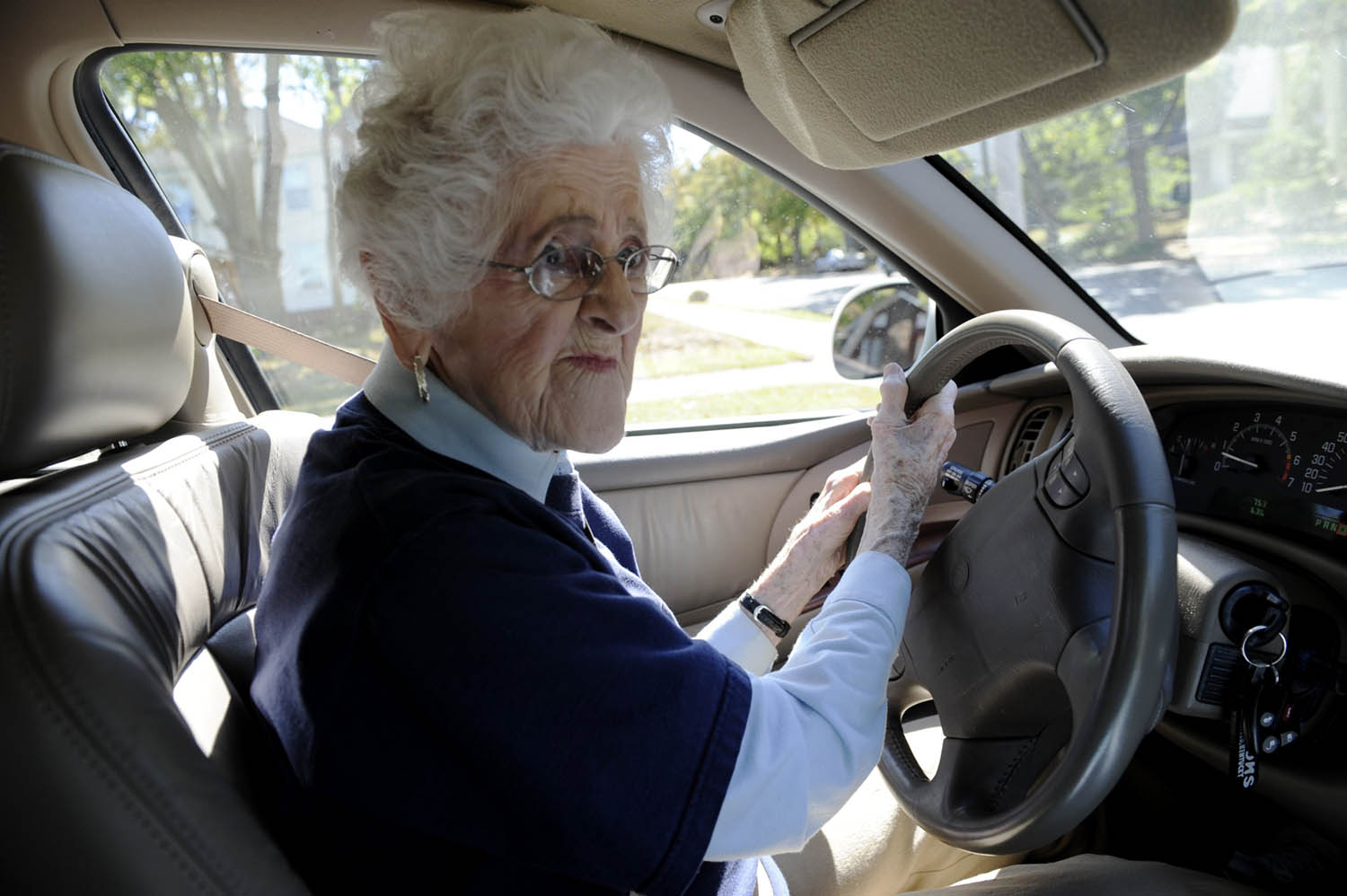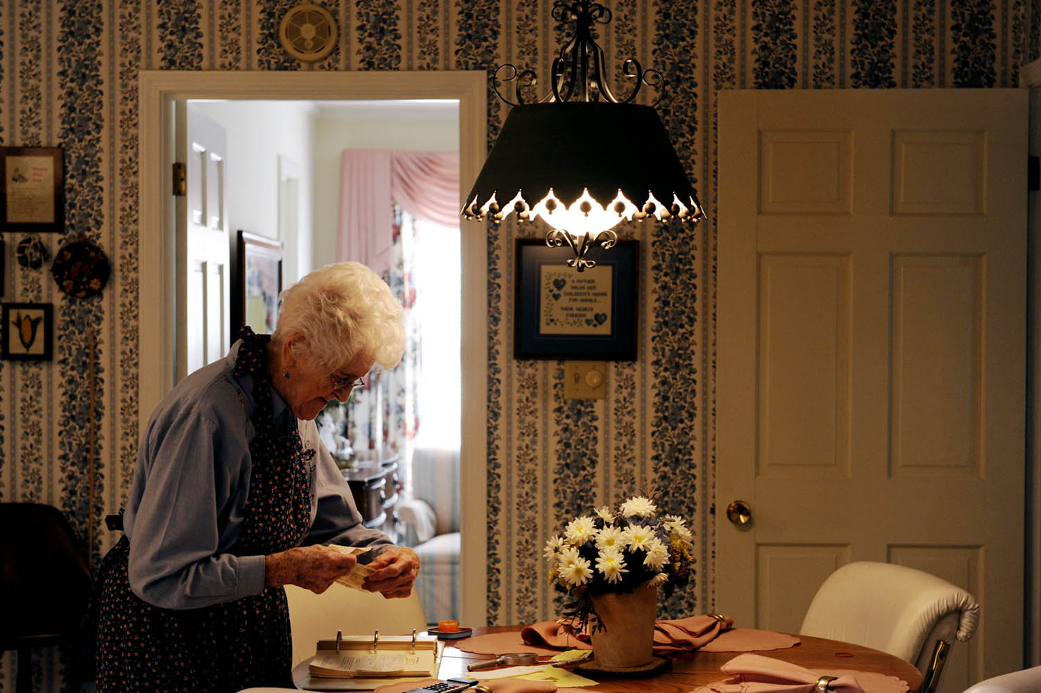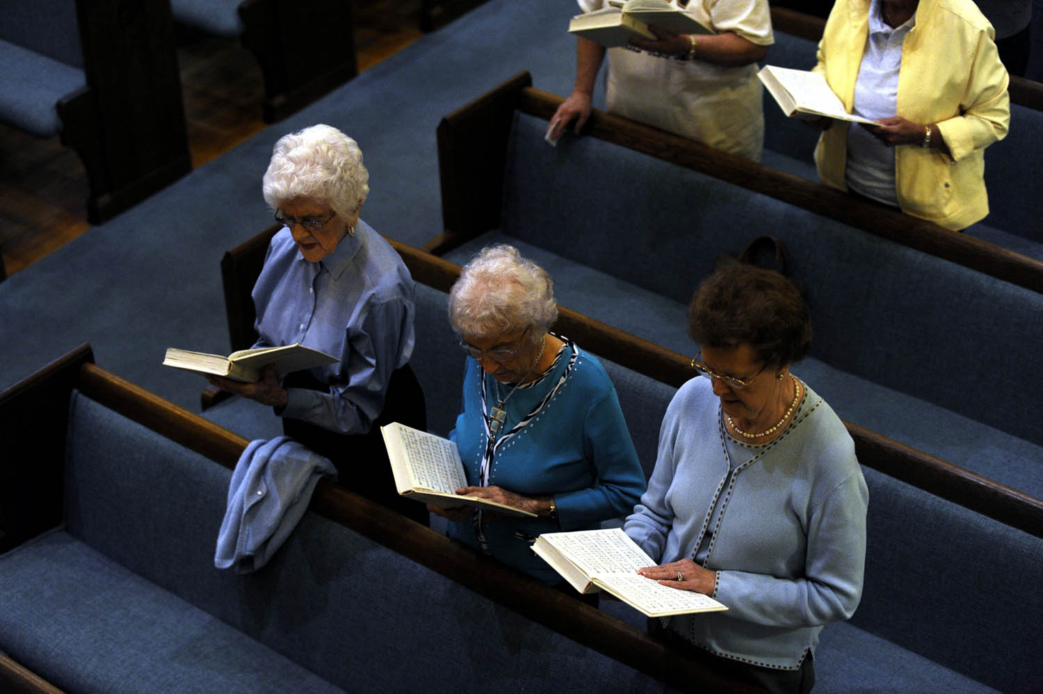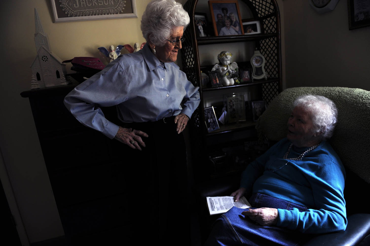 Ruth Tucker, 95, at left, talks about when she taught Hattie Jackson's children, while visiting the Green Acres Healthcare nursing home. "I always see if I can give them a smile," said Tucker of visiting old friends every other week. Most of those she visits, like Jackson who is 87, are younger in age.Ruth Tucker started driving 84 years ago when her grandmother gave her a Ford Model T. "The boys would always ask me to drive them around because they thought I was the best driver," said Tucker. At age 95 Tucker peers out for oncoming traffic after leaving the Heritage Manor Health Care Center in Mayfield.(2008 Merissa Ferguson / The Mountain Workshops)Ruth Tucker, 95, who was a Sunday school teacher up until two years ago at the First Baptist Church in Mayfield, sings with two of her closest friends, Mary Ellen Bingham, 92, center, and Dorothy Brown, 85, right, during prayer service Wednesday evening. The three are all widowed and drive to and from church together waiting until each one is in their house and lights on before driving away. (2008 Merissa Ferguson / The Mountain Workshops)Ruth Tucker, 95, looks for denture cleanser at the Food Giant grocery store in Mayfield. Tucker does her own grocery shopping.Ruth Tucker's white locks are massaged by her second cousin Betty Dillon at the Hairport Hair Design near downtown Mayfield. "If you live your life real good you will have this hair when you're 95," said Dillon who is Tucker's second cousin.Ruth Tucker, 95, overlooks the recipe for an apple cake on a Friday afternoon in her kitchen. "I think every one of my teeth is a sweet one," said Tucker.Ruth Tucker holds her hands behind her back as she looks over recipes in old cookbooks.Charles Wimman, 76, embraces his aunt, Ruth Tucker, with a hello in her living room at her home in Mayfield. Tucker took Wiman and his brother into her home when their mother passed away at a young age. "Really I never could have made it without her," said Wiman.Ruth Tucker, 95, entertains her nephew Charles Wiman and niece Barbara Sullivan, with popcorn, pie and sodas. "She's a take charge person," said Sullivan.While peering out the windows in her living room Ruth Tucker, 95, noticed many birds congregating in her bird bath filled with dirty water. "I can't just sit and watch this," said Ruth, who felt horrible they did not have fresh clean water. Tucker swept out the old water before adding the fresh water just before dusk.