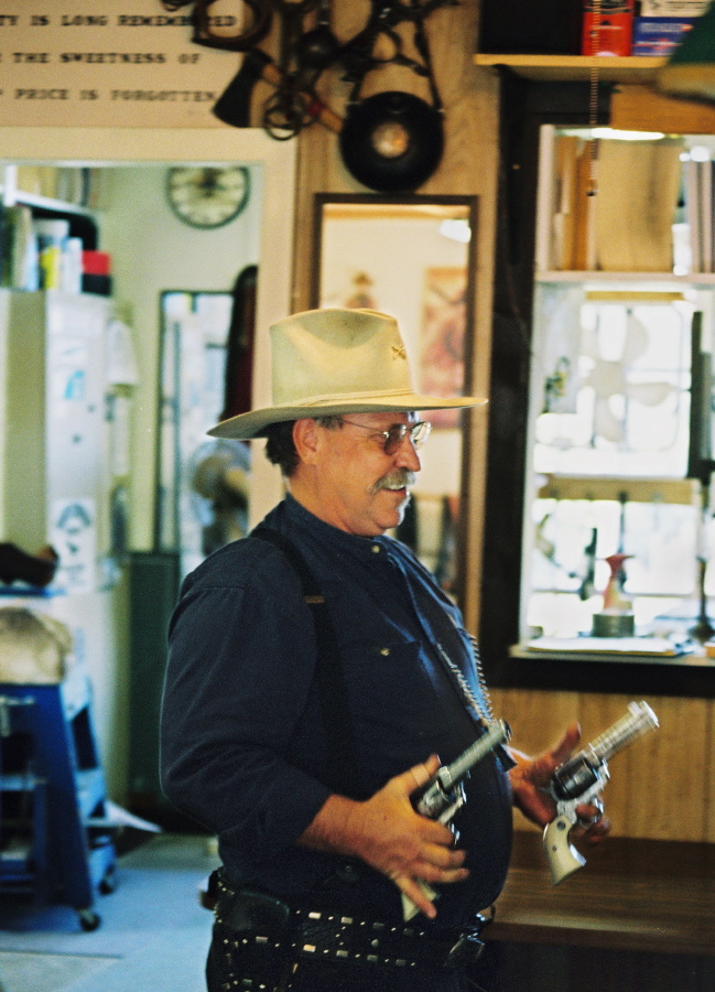 "Do you know what cowboy shooting is?" asked Pete Harry, owner of Pete's Custom Saddle Shop located on Russellville road. Harry, along with other locals, dress up in Western wear and react historic events that have happened in towns such as Hopkinsville. Harry is a native of Washington state, has three purple hearts he obtained with serving with the Special Forces in the United States Army, and taught at Murry State for 4 years. Harry is a founding member of the Rough Riders, and a member of the American Mountain Man Association. When asked about his cowboy side Harry said, "It's a way of life...my daughter says I should have been born in a different century."The first leaf showing fall colors brought in to share with her husband."I see you, I see you, la la la la la la," sang Nada Faqua with her private Kindermusik student, Zena Maddux, 2, as they danced around the class room, of First Christian Church. They choreographed their song with colored scarfs, "She accepts me as an older playmate and I think it's great," Faqua said. 9/30/01 The congregation of Means Avenue Baptist Church celebrated the seventh anniversary of their pastor, the Rev. Enoch Nyakoon (center), during a special service on Sunday afternoon. Clein-Wheh Nyakoon (right), 5, laughs as she sits on her father's lap while sister Teebeh (left), 8, looks on. Rev. Nyakoon, a native of Liberia, helped to found the church seven years ago and grow it from 5 members to 150 on the present rolls. (Photo by David T. Foster III)As the night's sky approaches, birds take flight from a plowed corn field near Canton Pike &...Amish produce auction, Fairview, KY.In the family's barn near Route 107 in Fearsville, Jeff Lacy begins the second firing of his two-acre tobacco crop. This is dark tobacco, used mainly for chewing, snuff and cigars. Tobacco should be fired for 40 days and 40 nights, Lacy says. Firings usually last a week.Daughter Ann Ramage, right, keeps owner Mac Arthur company on a slow afternoon at Young Hardware.Kai Nierula and Alexis Whitfield at play, First United Methodist Church in Hopkinsville, KY.The Hoptown Tigers are warming up before breaking together with the team from Hopkinsville County. The players from Hopkinsville High School are finding "their way" on the field at "Stadium of Champions" in Tie Breaker Park, Hopkinsville.