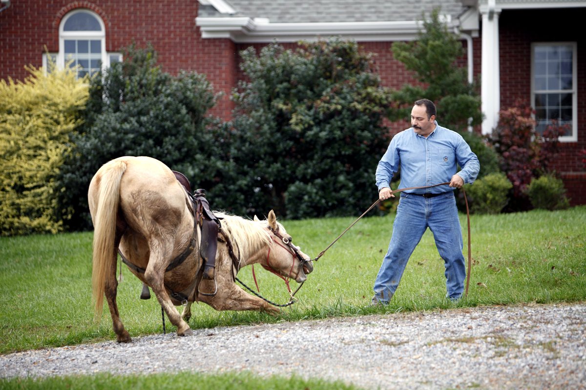 He starts his day at the barn. In October, Dandy was the newest member of his equine family, so Michael spent the early-morning hours taming her temper with walking routines.