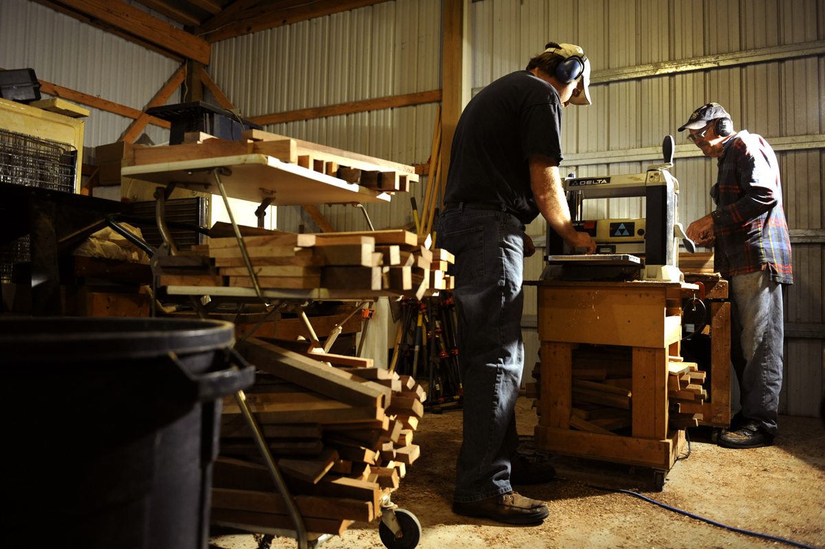It’s early morning at the Miller Farm in Calloway County. Table saws and wood sanders buzz inside a metal building, where a sawdust fog fills the air.