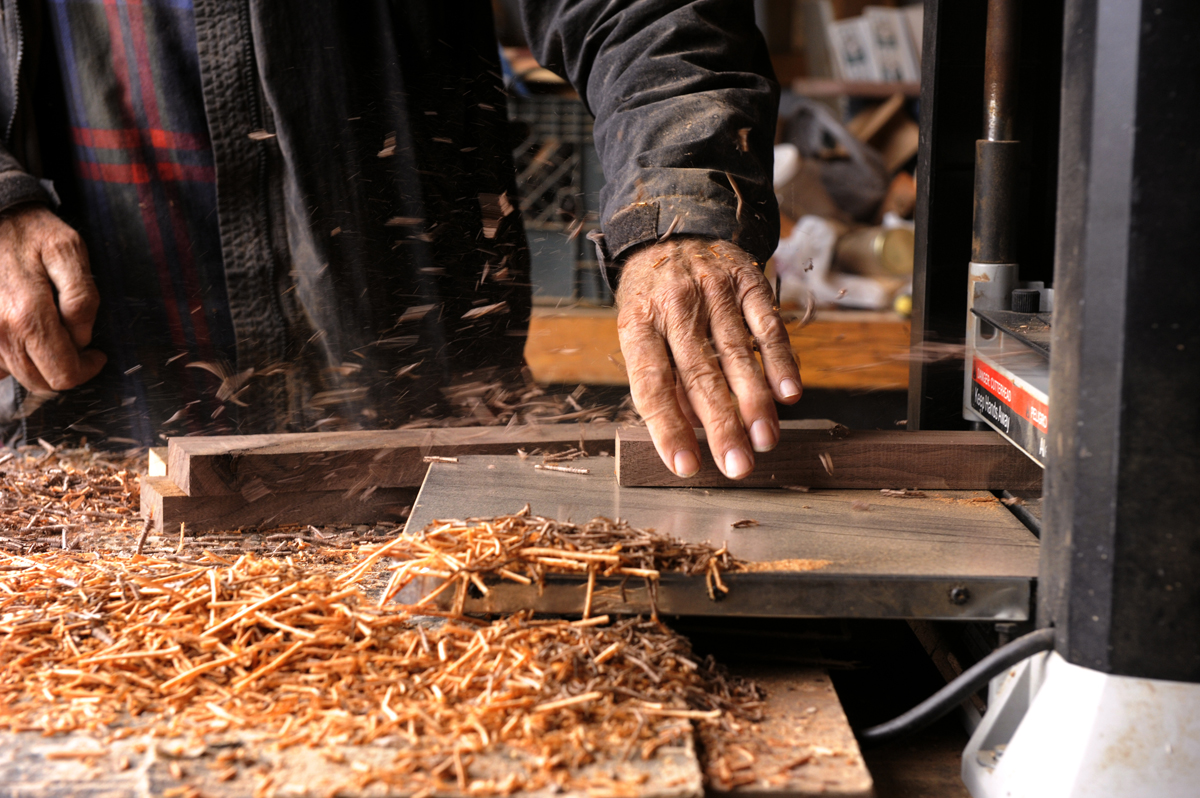 As Claude sands the first board of the day, his son, Jeff, walks in. Claude has been making these cutting boards for more than three years. The pieces, which combine cherry and walnut, often take two days to complete. Jeff has been helping him for nearly a month.