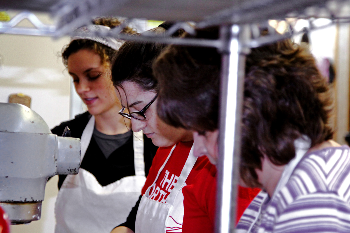 Back at the shop, The Cake Lady and her daughters, April 24, and Alissa, 20, oversee whining blenders, cracking eggshells and pans getting lined and greased.