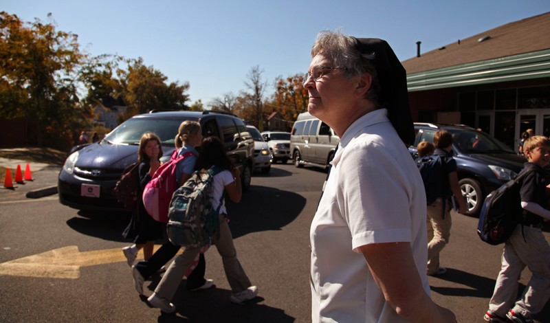 An hour later, she switches on the lights in St. James and puts on a pot of coffee for her staff. Behind stacks of paper and a row of videotapes, Sister Michael reviews test scores, orders Christmas presents for her staff and checks e-mail – all before directing traffic and helping students enter the school safely.