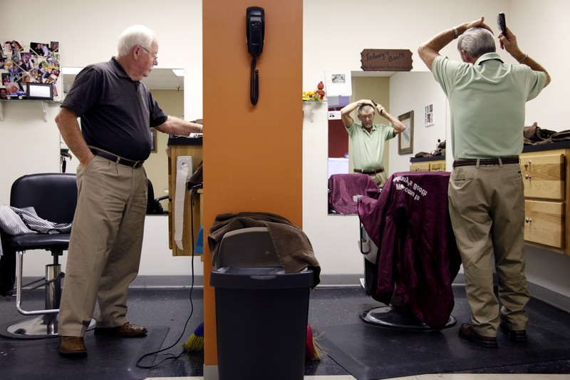 Francis and Johnnie were two of seven boys in the Simpson family raised by their widowed mother. The two men have built houses on the property where they grew up and live there with their families. The pair joke that as children, the seven brothers shared one bed, and that this is why they have been able to work together and get along since they opened their first barbershop downtown in 1964.