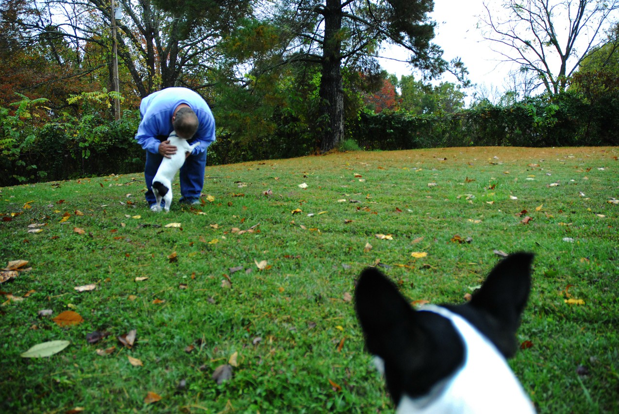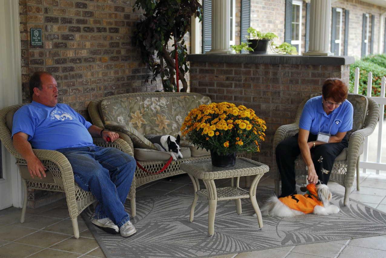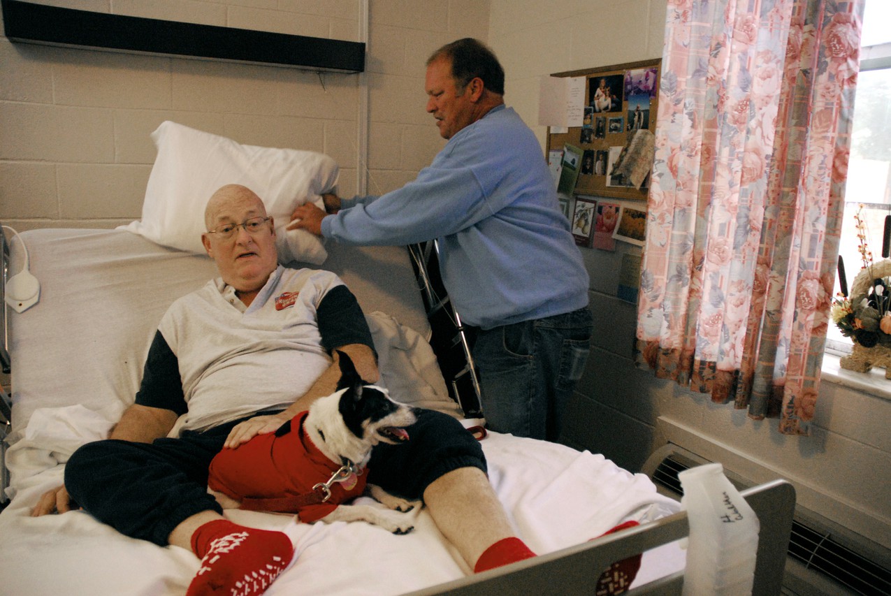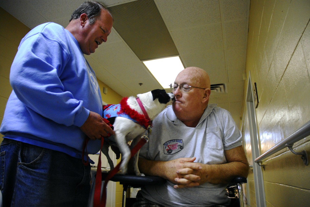 When Bob first started making visits, his dad, Tom, didn’t understand why he liked visiting people with his dogs. Then Tom had a brain tumor removed in mid-August. Bob and his dogs now visit him nearly every morning, and Tom sees firsthand the benefits. As Ollie curls up in between his legs in bed, Tom smiles. “It makes me feel good — or better.”