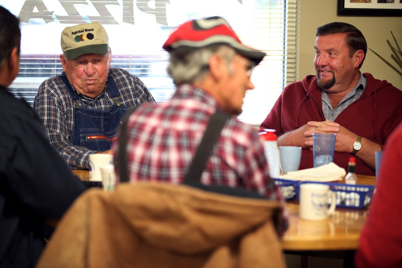 In the afternoon, Jim climbs back into his truck and gets onto the winding road that will take him to the old pizza place for lunch. His friends are already there, teasing each other and reminiscing about old times.
